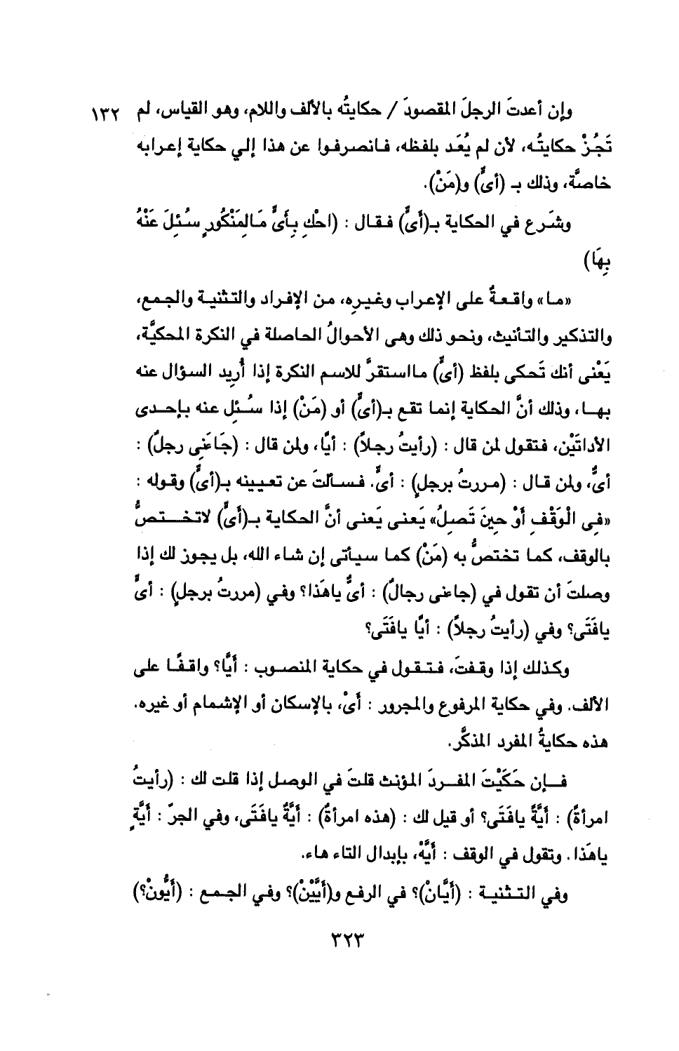 وكذلك إذا وقفت، فتقول في حكاية المنصوب: أيًّا؟ واقفًا على الألف. وفي حكاية المرفوع والمجرور: أي، بالإسكان أو الإشمام أو غيره. هذه حكاية المفرد المذكر.