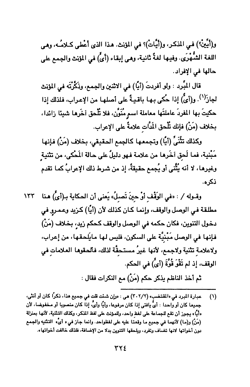 قال المبرد: ولو أفردت (أيًا) في الاثنين والجمع، وذكرته في المؤنث لجاز. و (أي) إذا حكي بها باقية على أصلها من الإعراب، فلذلك إذا حكيت بها المفرد عاملتها معاملة اسم منون، فلا تلحق آخرها شيئا زائدا، بخلاف (من) فإنك تلحق المدات علامة على الإعراب.