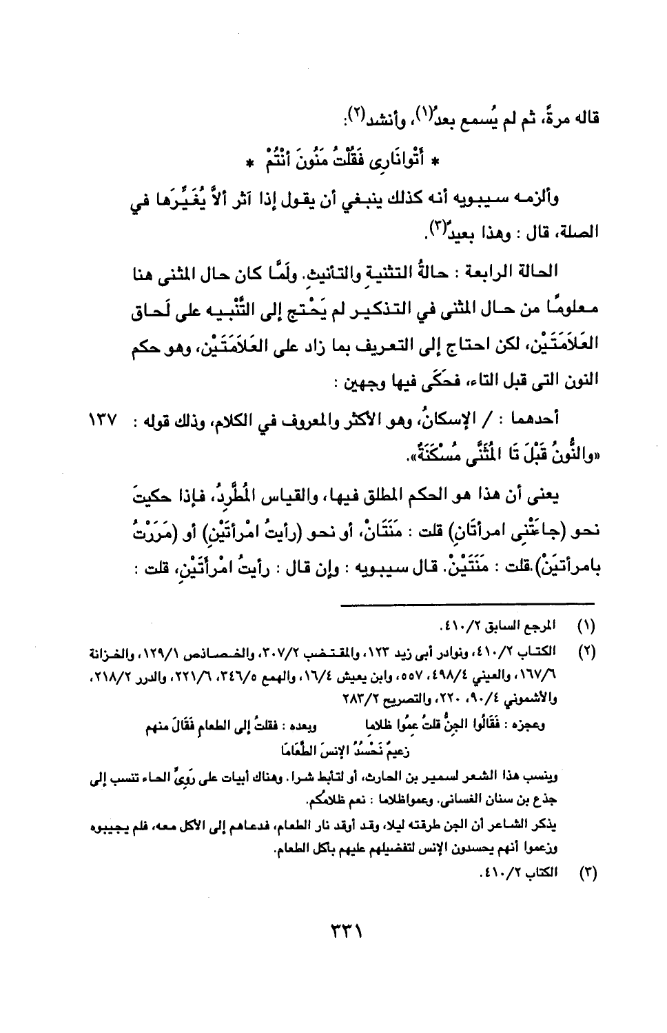 أحدهما: / الإسكان، وهو الأكثر والمعروف في الكلام، وذلك قوله: "والنون قبل تا المثنى مسكنة".