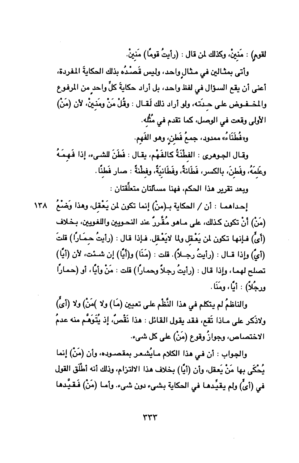والجواب: أن في هذا الكلام ما يشعر بمقصوده، وأن (من) إنما يحكي بها من يعقل، وأن (أيًا) بخلاف هذا الالتزام، وذلك أنه أطلق القول في (أي) ولم يقيدها في الحكاية بشيء دون شيء. وأما (من) فقيدها
