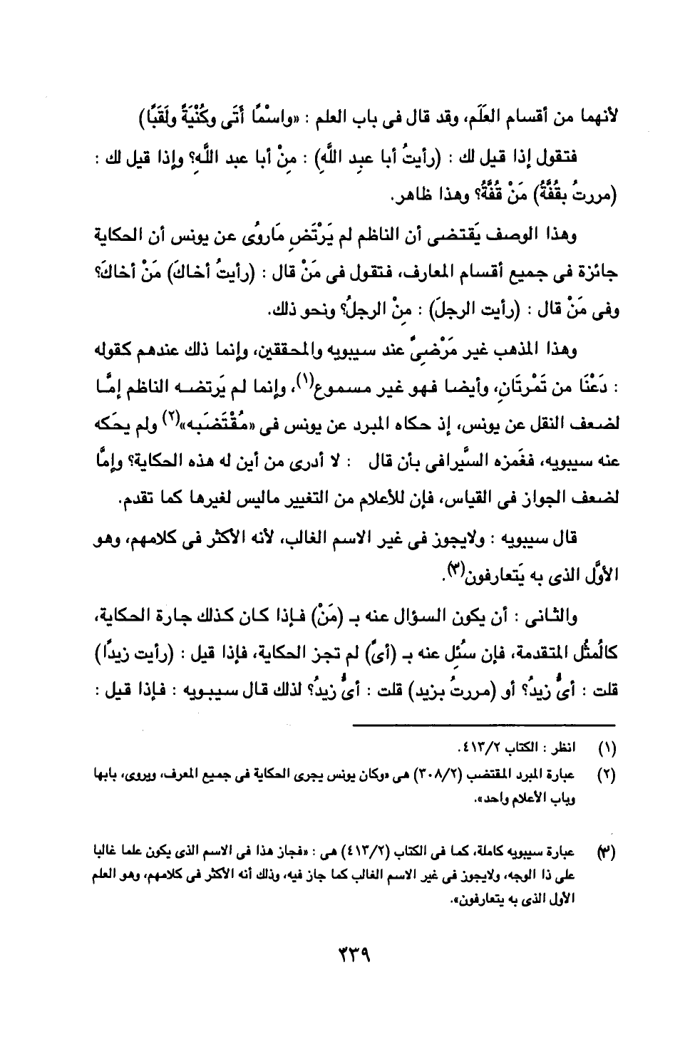 وهذا الوصف يقتضى أن الناظم لم يرتض ما روي عن يونس أن الحكاية جائزة في جميع أقسام المعارف، فتقول في من قال: (رأيت أخاك) من أخاك؟ وفي من قال: (رأيت الرجل): من الرجل؟ ونحو ذلك.
