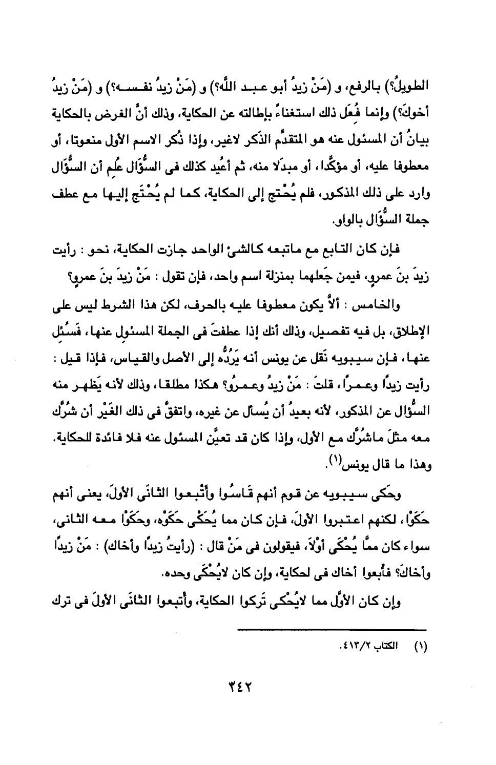 الطويل؟ ) بالرفع، و (من زيد أبو عبد الله؟ ) و (من زيد نفسه؟ ) و (من زيد أخوك؟ ) وإنما فعل ذلك استغناء بإطالته عن الحكاية، وذلك أن الغرض بالحكاية بيان أن المسئول عنه هو المتقدم الذكر لا غير، وإذا ذكر الاسم الأول منعوتا، أو معطوفا عليه، أو مؤكدًا، أو مبدلا منه، ثم أعيد كذلك في السؤال علم أن السؤال وارد على ذلك المذكور، فلم يحتج إلى الحكاية، كما لم يحتج إليها مع عطف جملة السؤال بالواو.