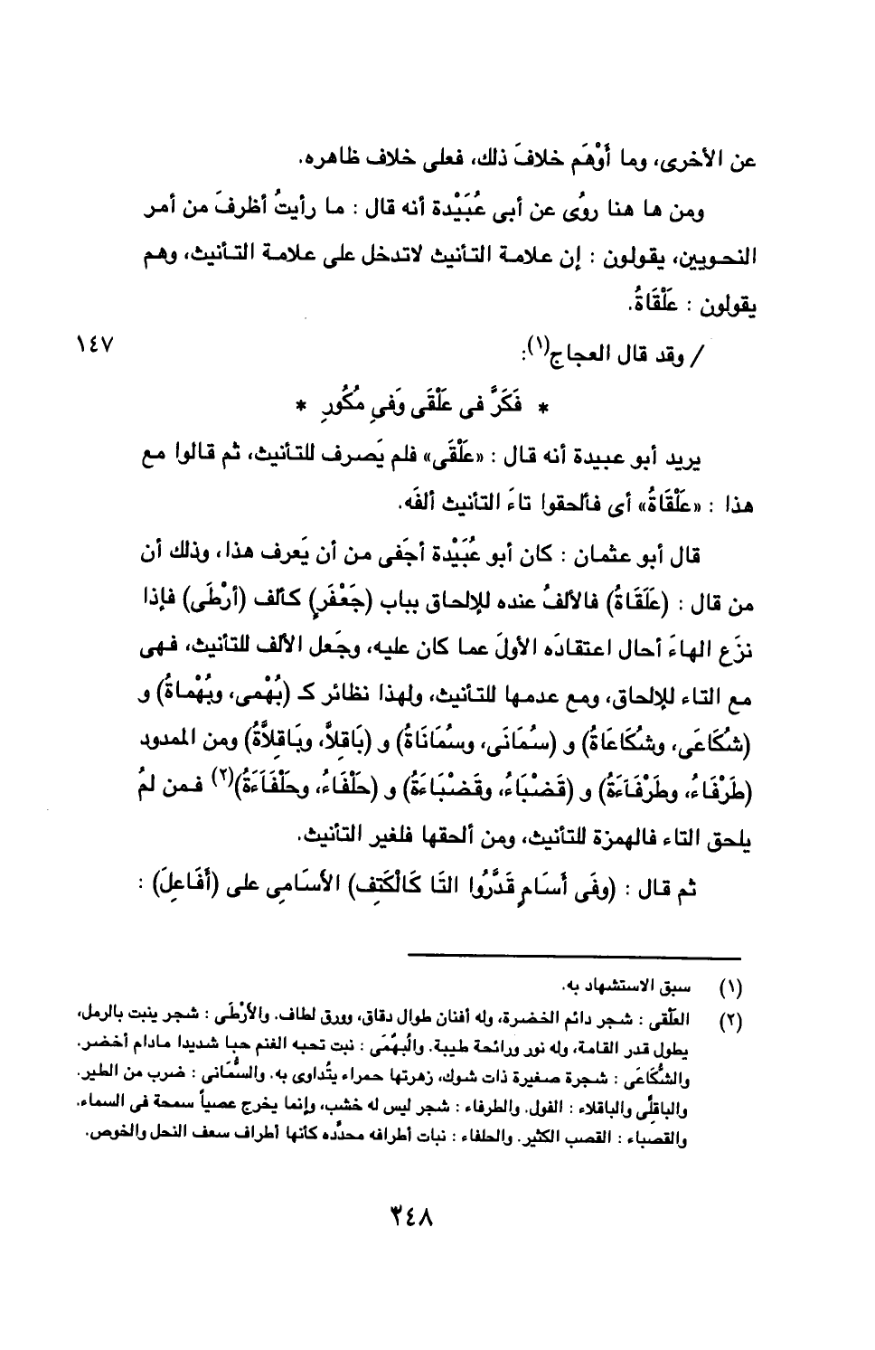 قال أبو عثمان: كان أبو عبيدة أجفى من أن يعرف هذا، وذلك أن من قال: (علقاة) فالألف عنده للإلحاق بباب (جعفر) كألف (أرطى) فإذا نزع الهاء أحال اعتقاده الأول عما كان عليه، وجعل الألف للتأنيث، فهي مع التاء للإلحاق، ومع عدمها للتأنيث، ولهذا نظائر كـ (بهمي، وبهماة) و (شكاعى، وشكاعاة) و (سماني، وسماناة) و (باقلا، وباقلاة) ومن المددود (طرفاء، وطرفاءة) و (قضباء، وقضباءة) و (حلفاء، وحلفاءة) فمن لم يلحق التاء فالهمزة للتأنيث، ومن ألحقها فلغير التأنيث.