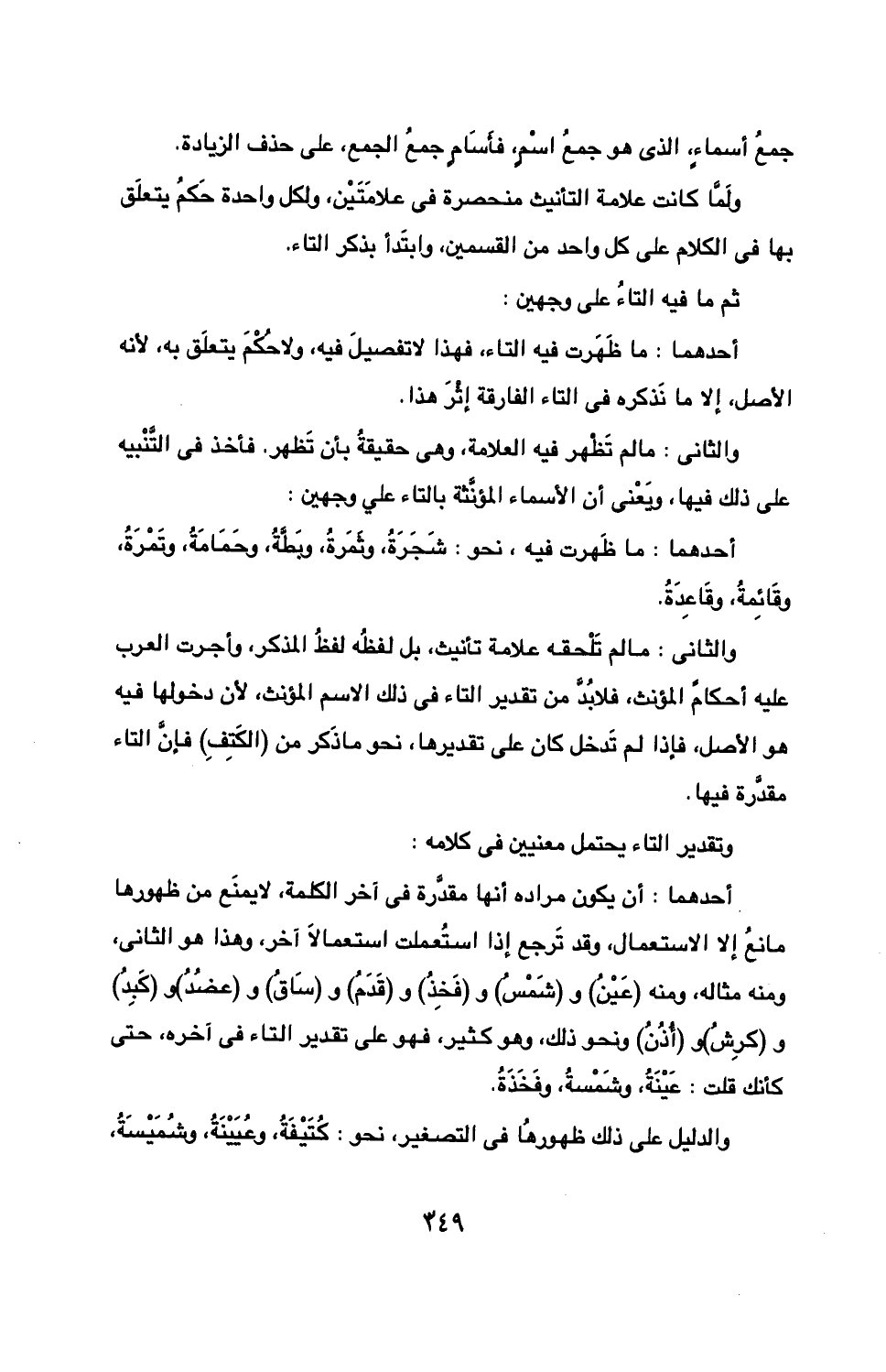 أحدهما: أن يكون مراده أنها مقدرة في آخر الكلمة، لا يمنع من ظهورها مانع إلا الاستعمال، وقد ترجع إذا استعملت استعمالاً آخر، وهذا هو الثاني، ومنه مثاله، ومنه (عين) و (شمس) و (فخذ) و (قدم) و (ساق) و (عضد) و (كبد) و (كرش) و (أذن) ونحو ذلك، وهو كثير، فهو على تقدير التاء في آخره، حتى كأنك قلت: عينة، وشمسة، وفخذة.