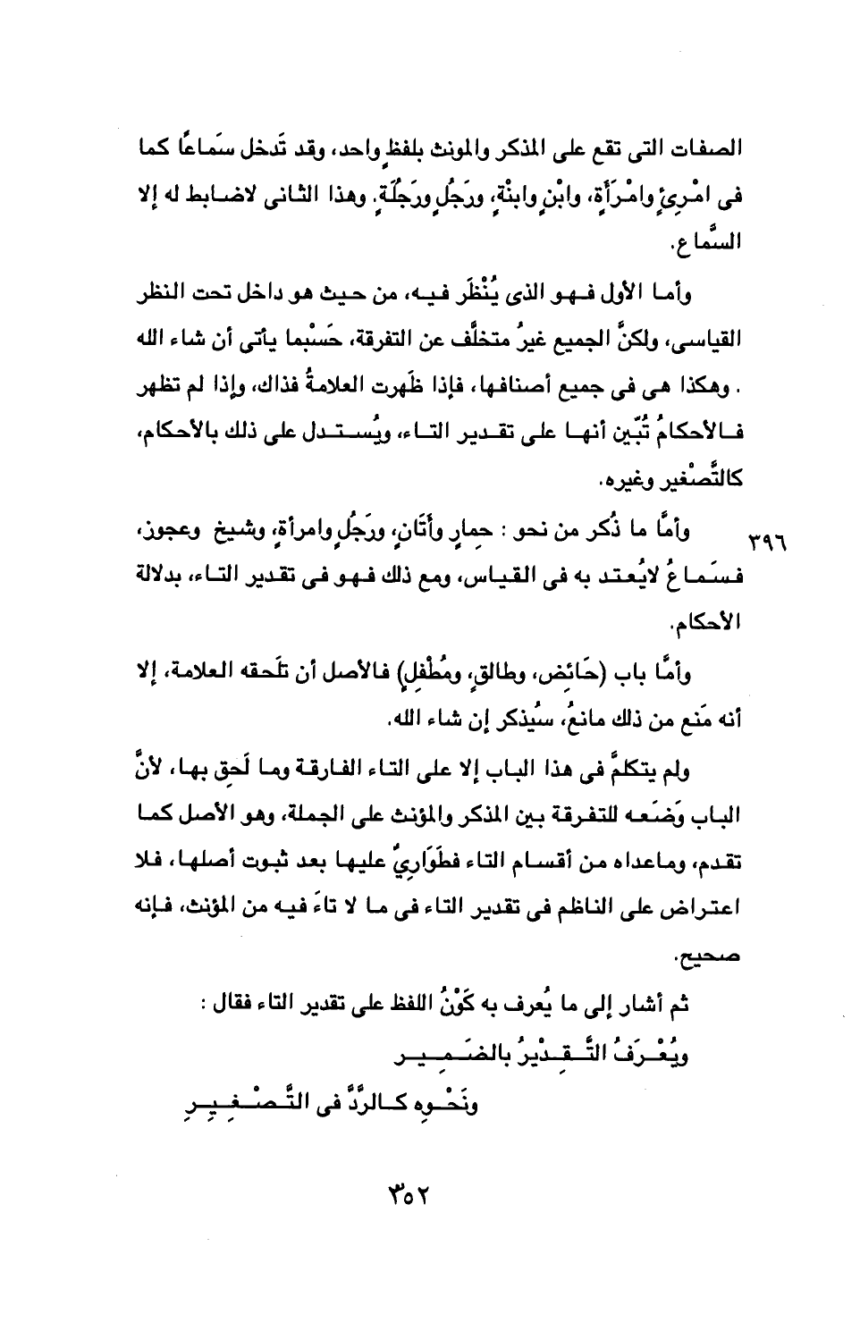 وأما الأول فهو الذي ينظر فيه، من حيث هو داخل تحت النظر القياسي، ولكن الجميع غير متخلف عن التفرقة، حسبما يأتي أن شاء الله وهكذا هي في جميع أصنافها، فإذا ظهرت العلامة فذاك، وإذا لم تظهر فالأحكام تبين أنها على تقدير التاء، ويستدل على ذلك بالأحكام، كالتصغير وغيره.