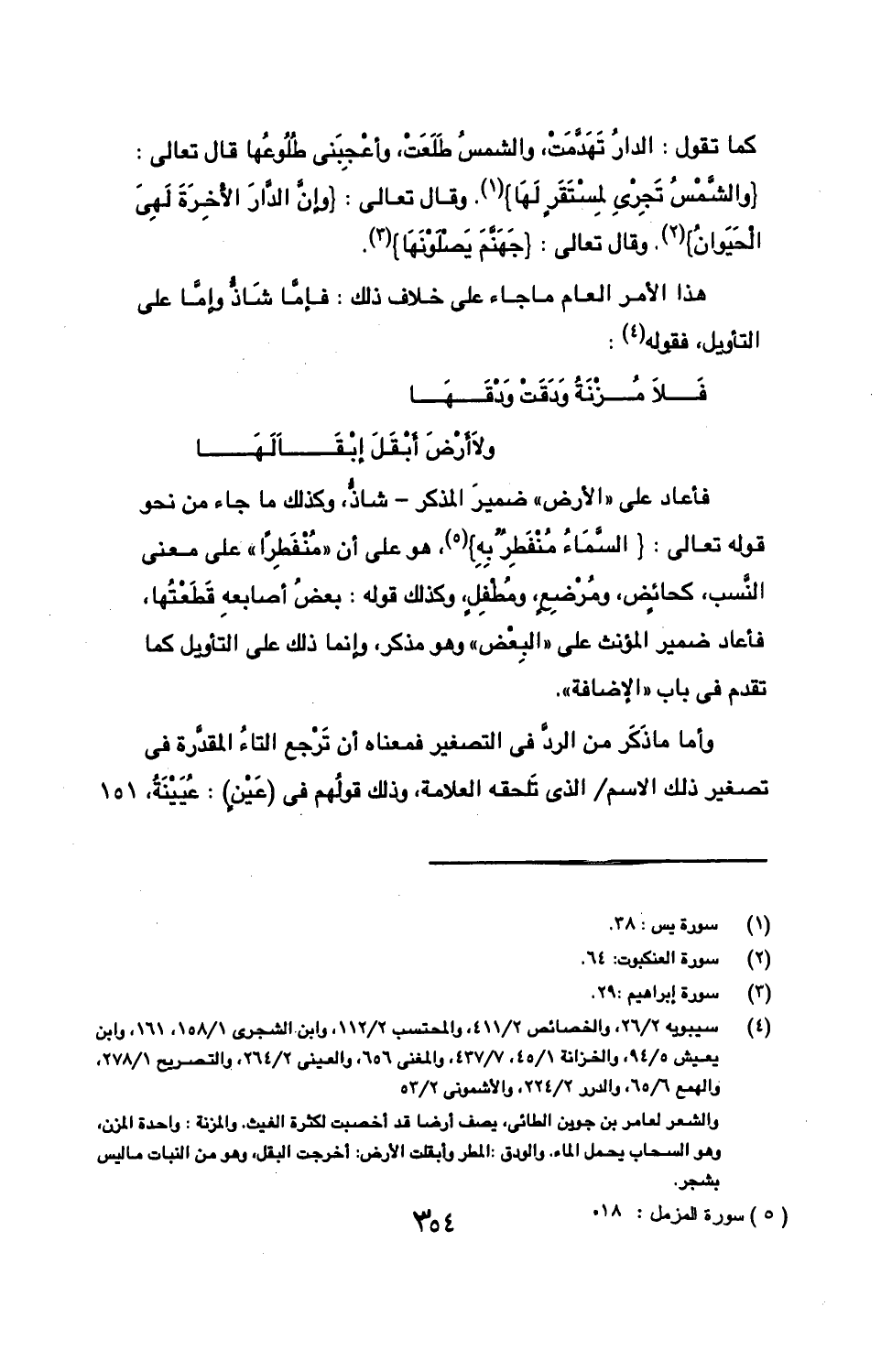 فأعاد على "الأرض" ضمير المذكر - شاذ، وكذلك ما جاء من نحو قوله تعالى: } السماء منفطر به}، هو على أن "منفطرًا" على معنى النسب، كحائض، ومرضع، ومطفل، وكذلك قوله: بعض أصابعه قطعتها، فأعاد ضمير المؤنث على "البعض" وهو مذكر، وإنما ذلك على التأويل كما تقدم في باب "الإضافة".