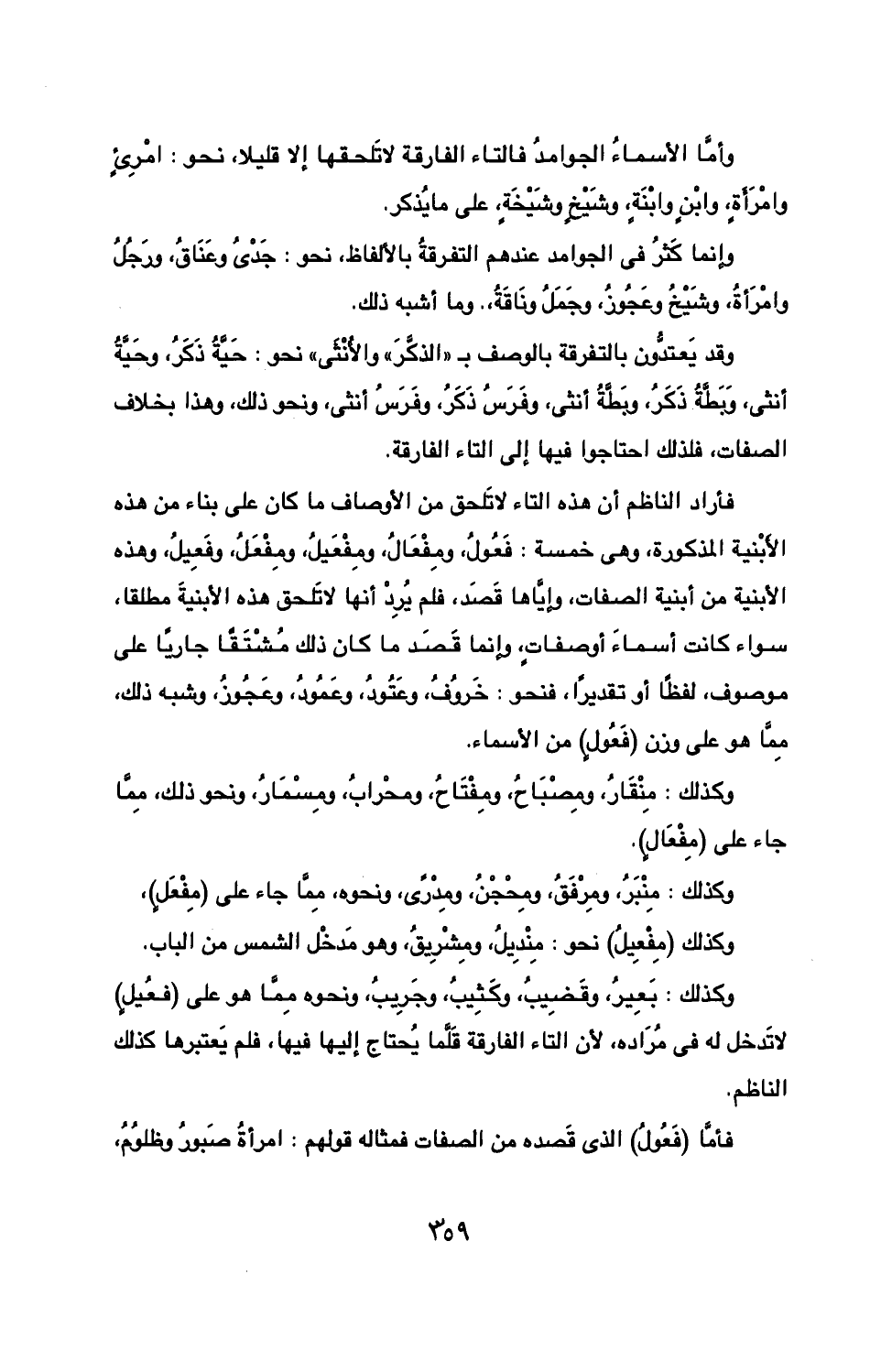 فأراد الناظم أن هذه التاء لا تلحق من الأوصاف ما كان على بناء من هذه الأبنية المذكورة، وهي خمسة: فعول ومفعال، ومفعيل، ومفعل، وفعيل، وهذه الأبنية من أبنية الصفات، وإياها قصد، فلم يرد أنها لا تلحق هذه الأبنية مطلقا، سواء كانت أسماء أو صفات، وإنما قصد ما كان ذلك مشتقًا جاريًا على موصوف، لفظًا أو تقديرًا، فنحو: خروف، وعتود، وعمود، وعجوز، وشبه ذلك، مما هو على وزن (فعول) من الأسماء.