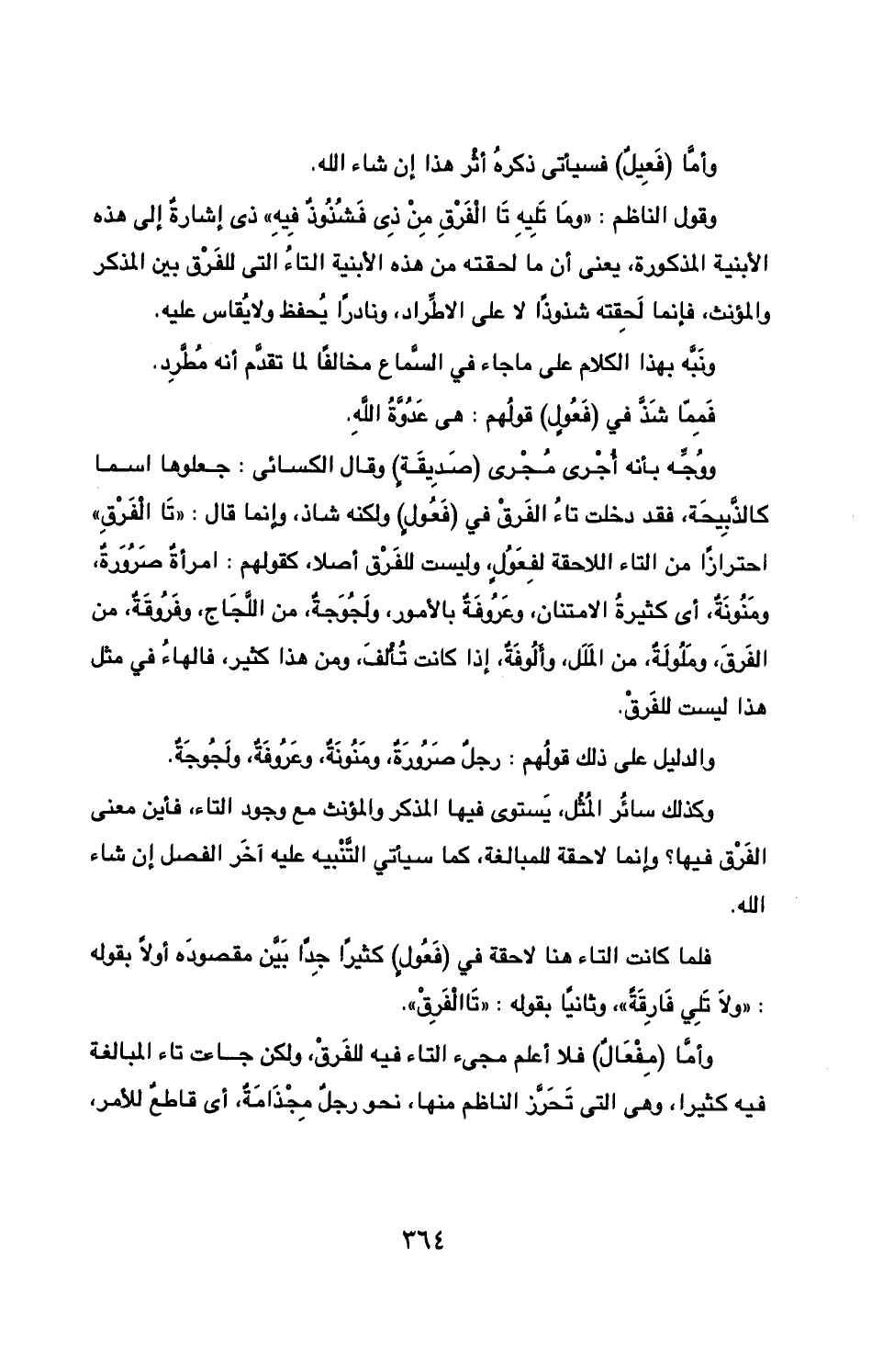 ووجه بأنه أجرى مجرى (صديقة) وقال الكسائي: جعلوها اسما كالذبيحة، فقد دخلت تاء الفرق في (فعول) ولكنه شاذ، وإنما قال: "تا الفرق" احتزازًا من التاء اللاحقة لفعول، وليست للفرق أصلا، كقولهم: امرأة صرورة، ومنونة، أي كثيرة الامتنان، وعروفة بالأمور، ولجوجة، من اللجاج، وفروقة، من الفرق، وملولة، من الملل، وألوفة، إذا كانت تألف، ومن هذا كثير، فالهاء في مثل هذا ليست للفرق.