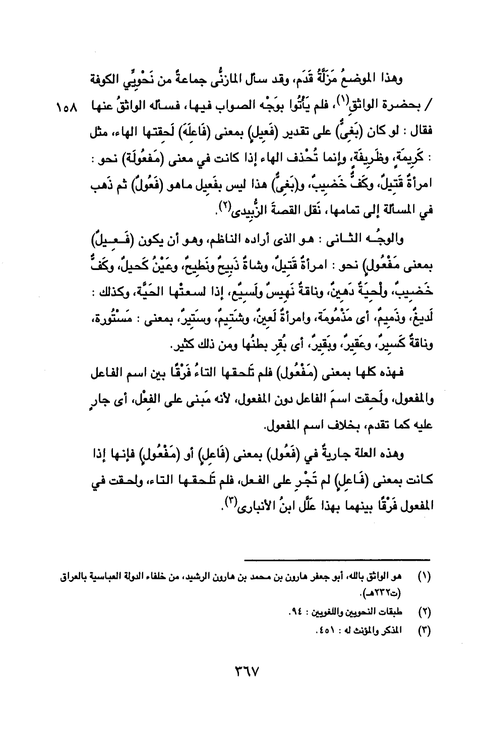 وهذا الموضع مزلة قدم، وقد سأل المازني جماعة من نحويي الكوفة/ بحضرة الواثق، فلم يأتوا بوجه الصواب فيها، فسأله الواثق عنها فقال: لو كان (بغى) على تقدير (فعيل) بمعنى (فاعله) لحقتها الهاء، مثل: كريمة وظريفة، وإنما تحذف الهاء إذا كانت في معنى (مفعولة) نحو: امرأة قتيل، وكف خضيب، و (بغى) هذا ليس بفعيل ماهو (فعول) ثم ذهب في المسألة إلى تمامها، نقل القصة الزبيدي.