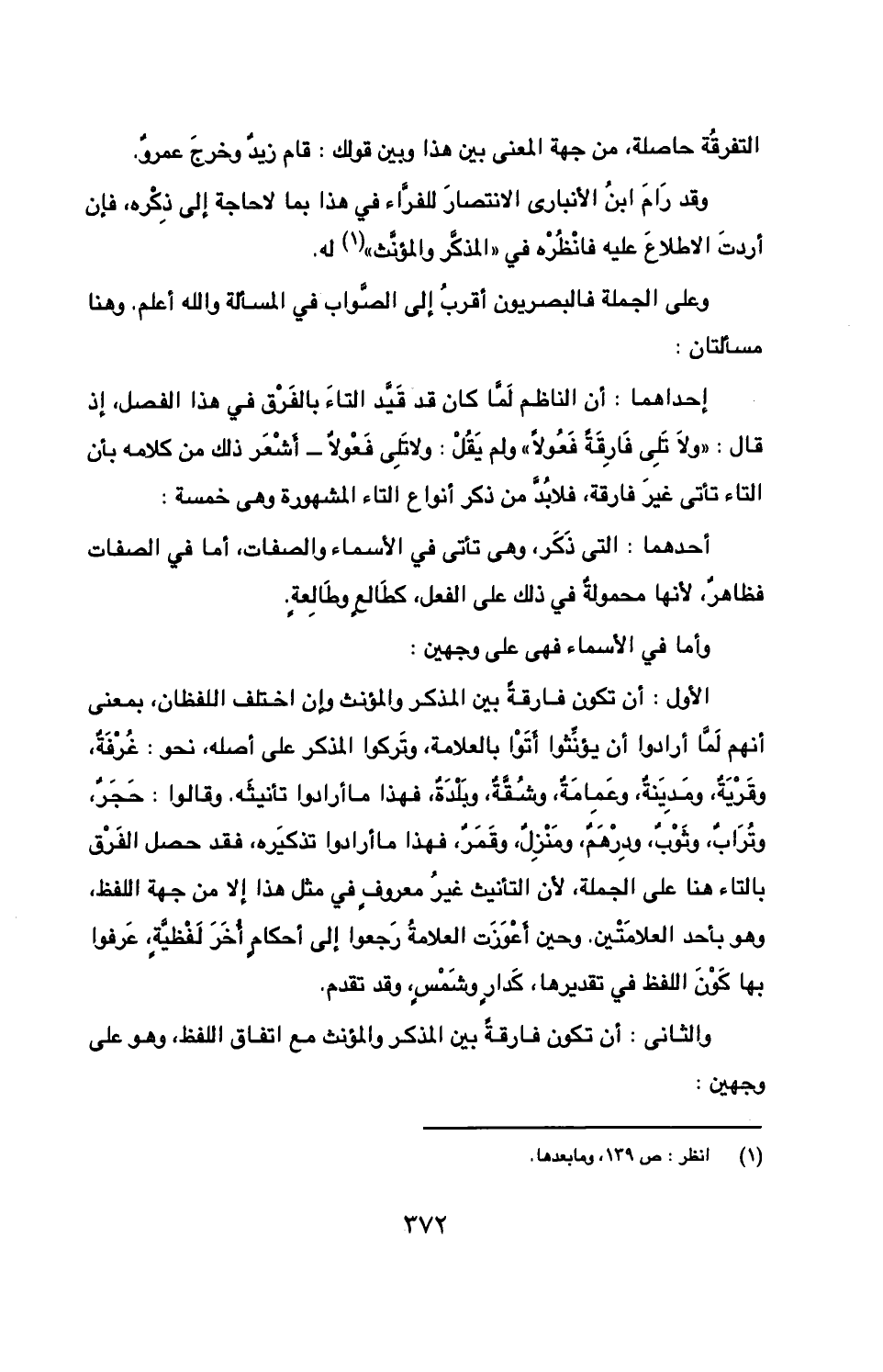 الأول: أن تكون فارقة بين المذكر والمؤنث وإن اختلف اللفظان، بمعنى أنهم لما أرادوا أن يؤنثوا أتوا بالعلامة، وتركوا المذكر على أصله، نحو: غرفة، وقرية، ومدينة، وعمامة، وشقة، وبلدة، فهذا ما أرادوا تأنيثه. وقالوا: حجر، وتراب، وثوب، ودرهم، ومنزل، وقمر، فهذا ما أرادوا تذكيره، فقد حصل الفرق بالتاء هنا على الجملة، لأن التأنيث غير معروف في مثل هذا إلا من جهة اللفظ، وهو بأحد العلامتين. وحين أعوزت العلامة رجعوا إلى أحكامٍ أخر لفظيةٍ، عرفوا بها كون اللفظ في تقديرها، كدار وشمس، وقد تقدم.
