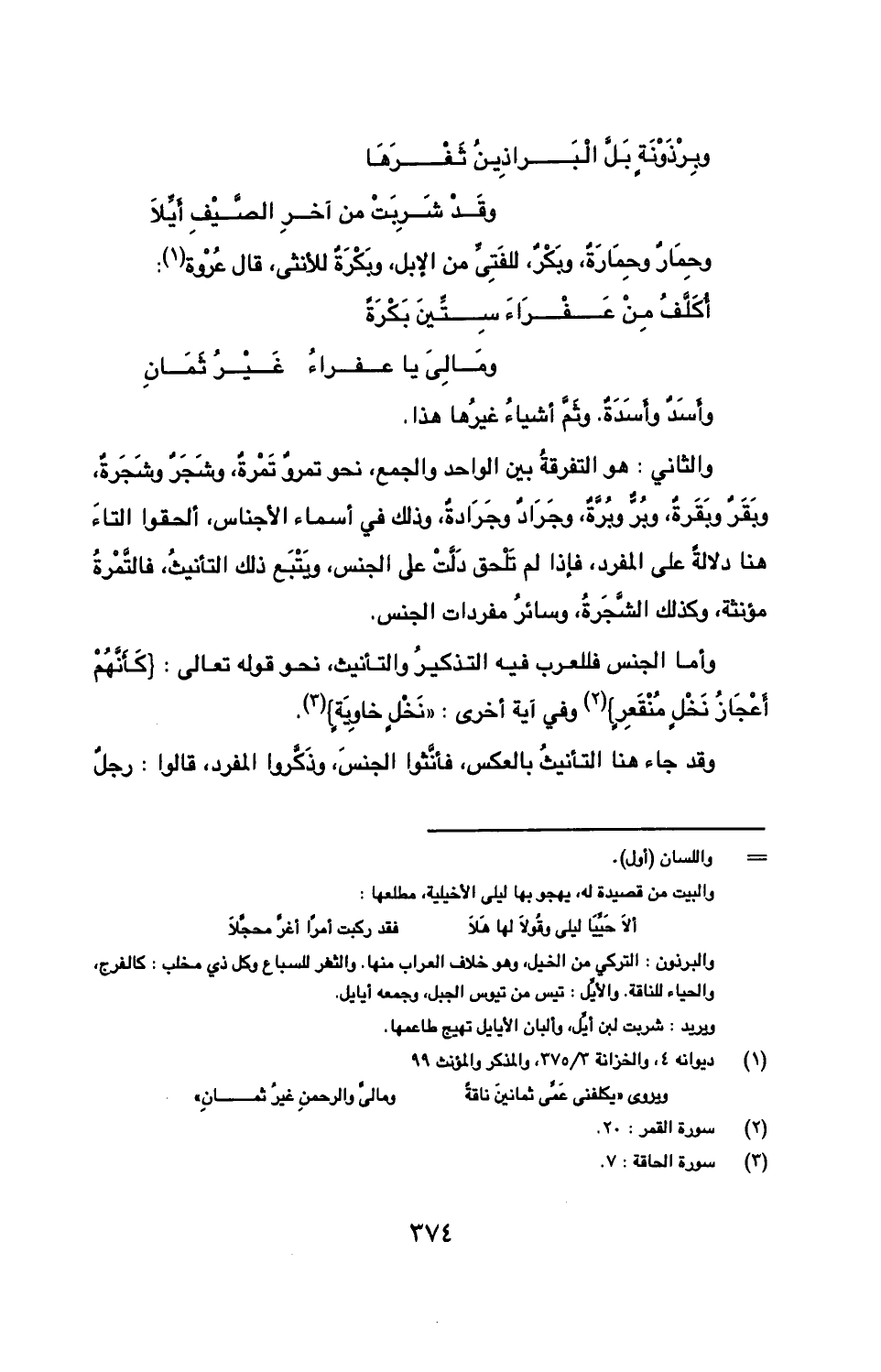 وأما الجنس فللعرب فيه التذكير والتأنيث، نحو قوله تعالى: } كأنهم أعجاز نخل منقعر} وفي آية أخرى: } نخل خاوية}.