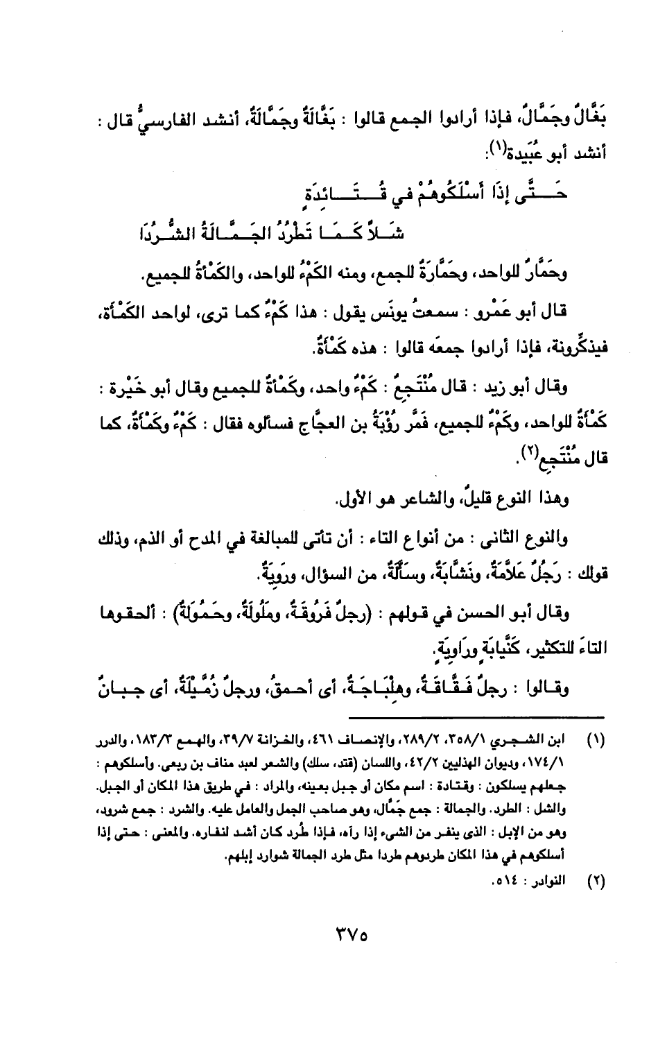 بغال وجمال، فإذا أرادوا الجمع قالوا: بغالة وجمالة، أنشد الفارسي قال: أنشد أبو عبيدة: