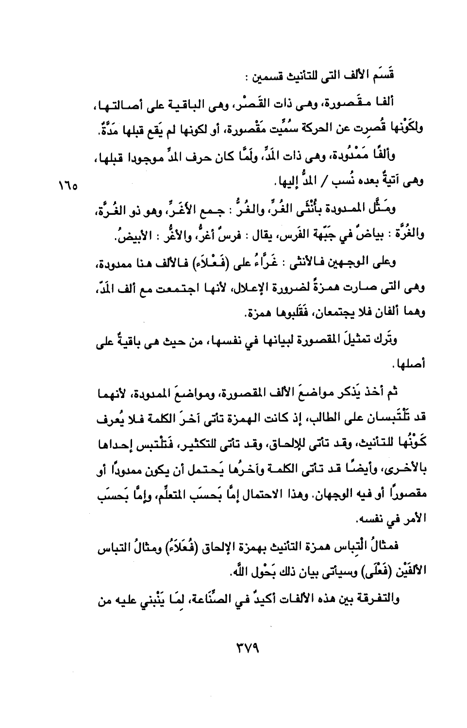 ثم أخذ يذكر مواضع الألف المقصورة، ومواضع الممدودة لأنهما قد تلتبسان على الطالب، إذ كانت الهمزة تأتي آخر الكلمة فلا يعرف كونها للتأنيث، وقد تأتي للإلحاق، وقد تأتي للتكثير، فتلتبس إحداها بالأخرى، وأيضًا قد تأتي الكلمة وآخرها يحتمل أن يكون ممدودًا أو مقصورًا أو فيه الوجهان. وهذا الاحتمال إما بحسب المتعلم، وإما بحسب الأمر في نفسه.