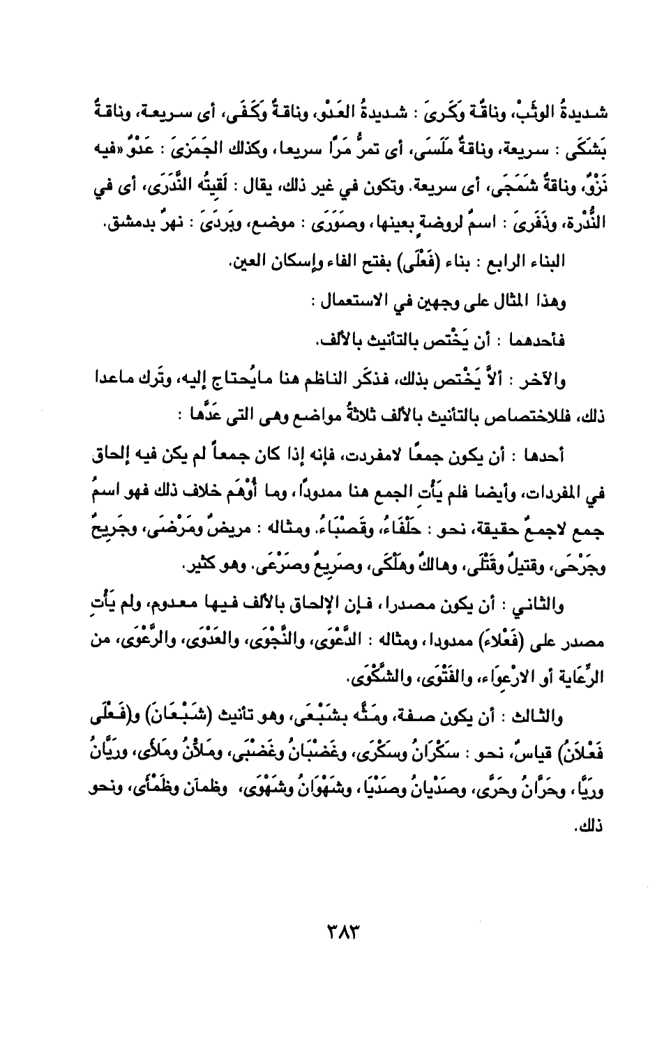 والثالث: أن يكون صفة، ومثه بشبعى، وهو تأنيث (شبعان) و (فعلى فعلان) قياس، نحو: سكران وسكرى، وغضبان وغضبى، وملآن وملأى، وريان وريا، وحران وحرى، وصديان وصديا، وشهوان وشهوى، وظمآن وظمأى، ونحو ذلك.