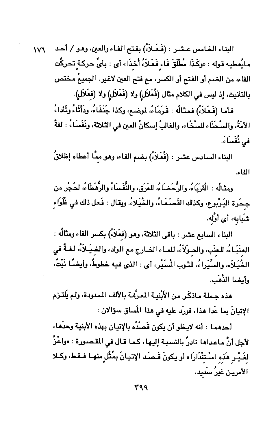 هذه جملة ما ذكر من الأبنية المعرفة بالألف الممدودة، ولم يلتزم الإتيان بما عدا هذا، فورد عليه في هذا المساق سؤالان: