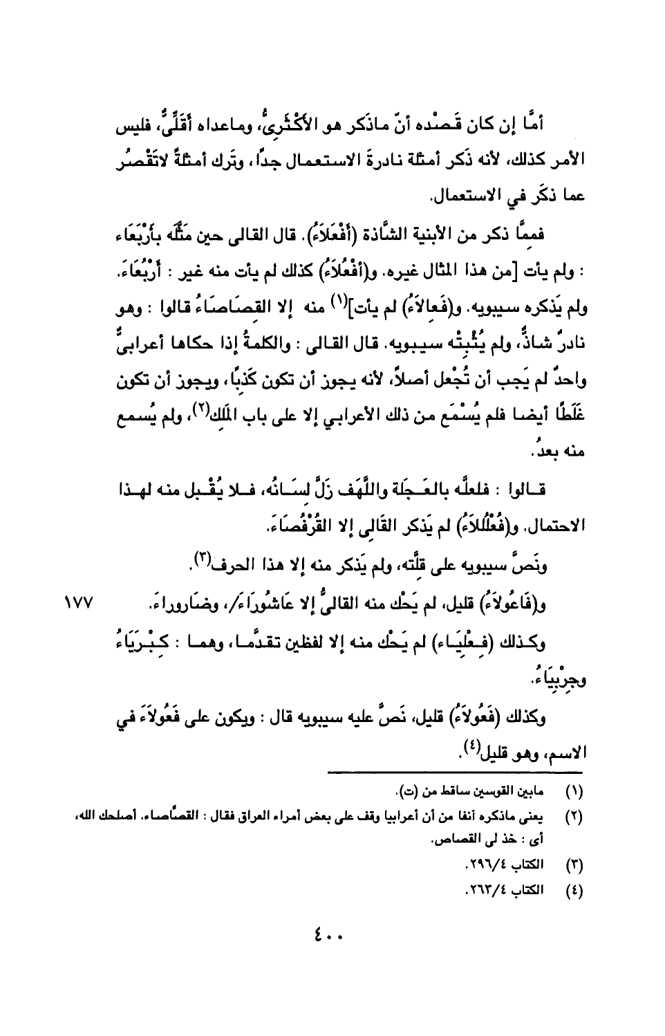 فمما ذكر من الأبنية الشاذة (أفعلاء). قال القالي حين مثله بأربعاء: ولم يأت [من هذا المثال غيره. و (أفعلاء) كذلك لم يأت منه غير: أربعاء. ولم يذكره سيبويه. و (فعالاء) لم يأت] منه إلا القصاصاء قالوا: وهو نادر شاذ، ولم يثبته سيبويه. قال القالي: والكلمة إذا حكاها أعرابي واحد لم يجب أن تجعل أصلاً، لأنه يجوز أن تكون كذبًا، ويجوز أن تكون غلطًا أيضًا فلم يسمع من ذلك الأعرابي إلا على باب الملك، ولم يسمع منه بعد.