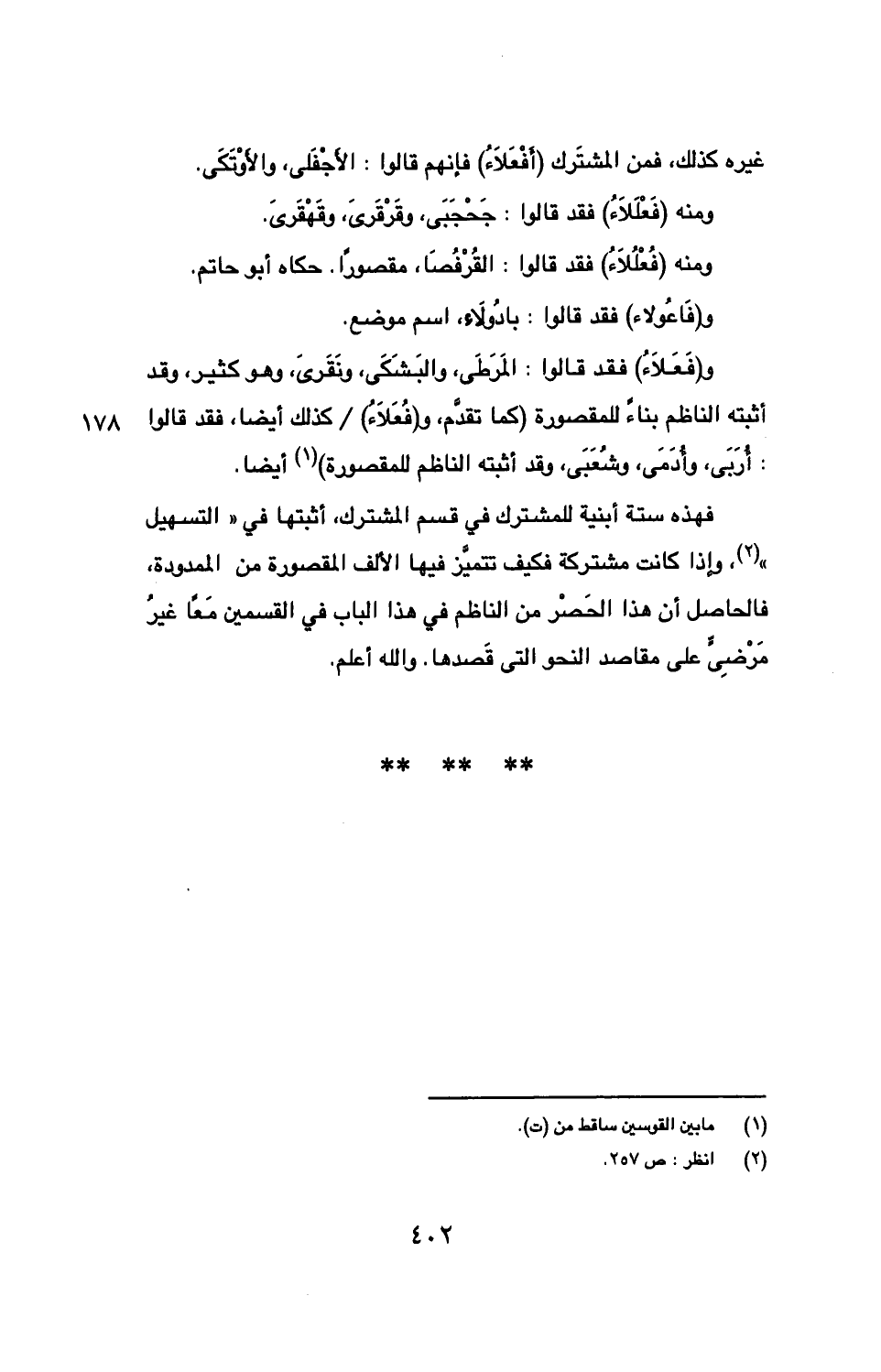 فهذه ستة أبنية للمشترك في قسم المشترك، أثبتها في "التسهيل"، وإذا كانت مشتركة فكيف تتميز فيها الألف المقصورة من الممدودة، فالحاصل أن هذا الحصر من الناظم في هذا الباب من القسمين معًا غير مرضي على مقاصد النحو التي قصدها. والله أعلم.