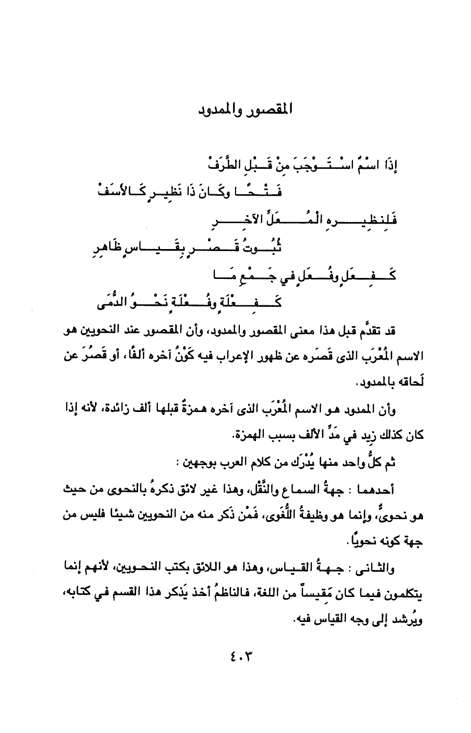 والثاني: جهة القياس، وهذا هو اللائق بكتب النحويين، لأنهم إنما يتكلمون فيما كان مقيسًا من اللغة، فالناظم أخذ يذكر هذا القسم في كتابه، ويرشد إلى وجه القياس فيه.