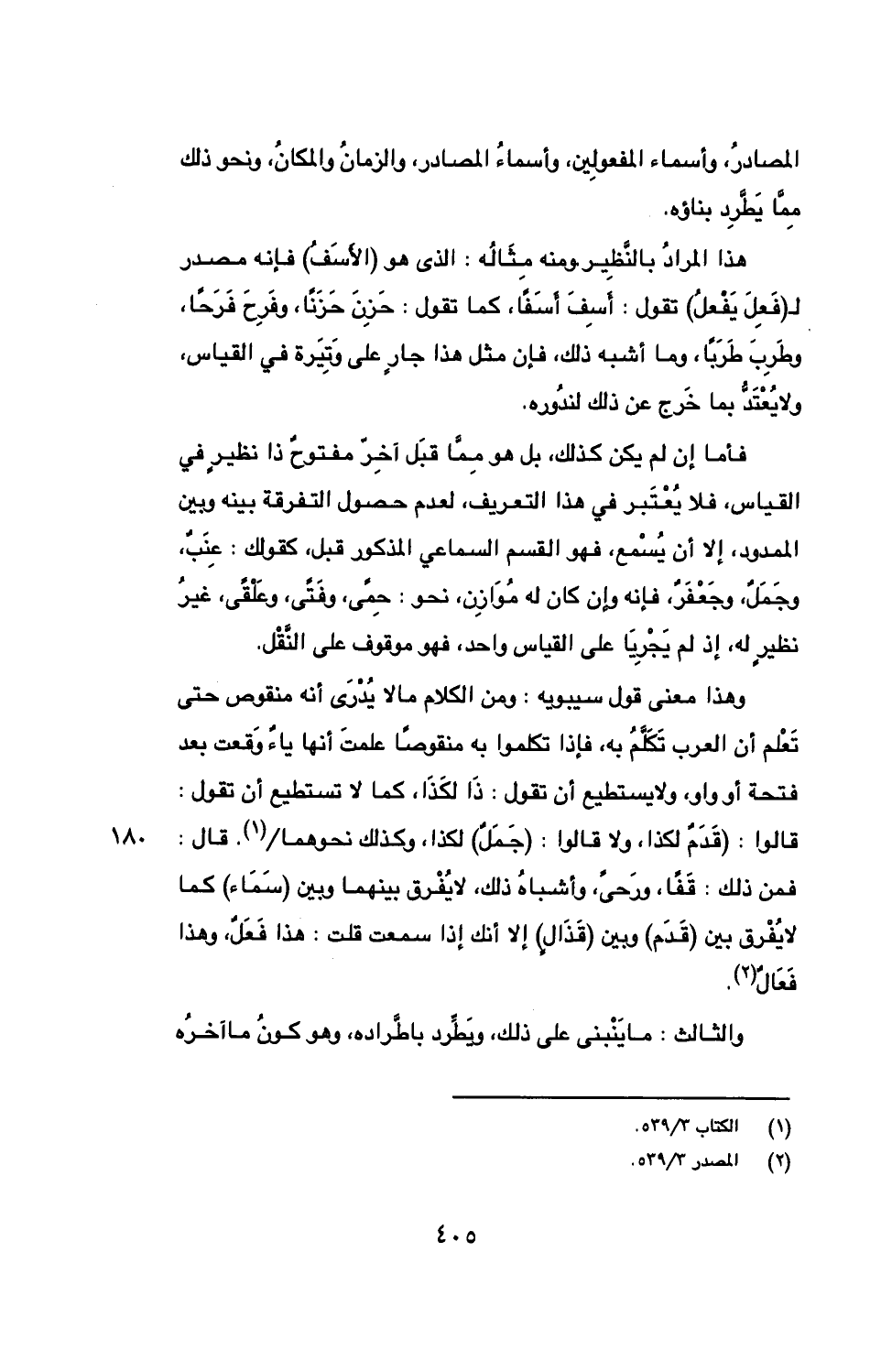 هذا المراد بالنظير ومنه مثاله: الذي هو (الأسف) فإنه مصدر لـ (فعل يفعل) تقول: أسف أسفًا، كما تقول: حزن حزنًا، وفرح فرحًا، وطرب طربًا، وما أشبه ذلك، فإن مثل هذا جار على وتيرة في القياس، ولا يعتد بما خرج عن ذلك لندوره.