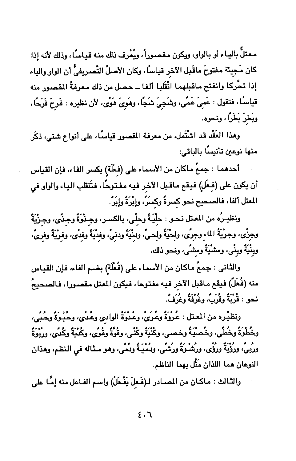 ونظيره من المعتل: عروة وعرى، وعدوة الواداي وعدى، وحبوة وحبى، وخطوة وخطى، وخصية وخصى، وكنية وكنى، وقوة وقوى، وكدية وكدى، وربوة وربى، ورؤية ورؤى، ورشوة ورشى، ودمية ودمى، وهو مثاله في النظم، وهذان النوعان هما اللذان مثل بهما الناظم.