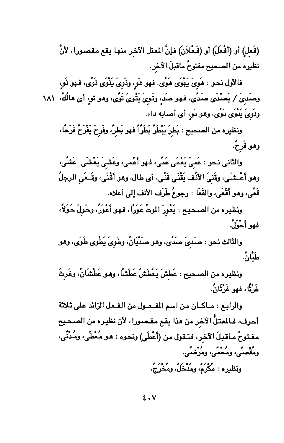 فالأول نحو: هوى يهوى هوى، فهو هو، وذوى يذوى ذوى، فهو ذو، وصدى/ يصدى صدى، فهو صد، وتوى يتوى توى، وهو تو، أي هالك، ودوى يدوى دوى، وهو دوٍ، أي أصابه داء.