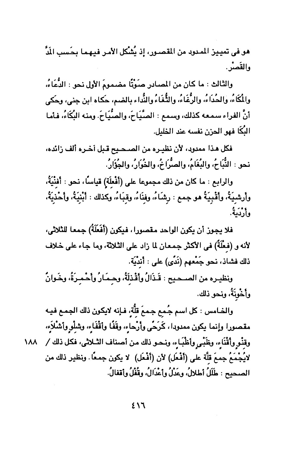 والرابع: ما كان من ذلك مجموعًا على (أفعلة) قياسًا، نحو: أفنية، وأرشية، وأقبية هو جمع: رشاء، وفناء، وقباء، وكذلك: أبنية، وأحذية، وأردية.