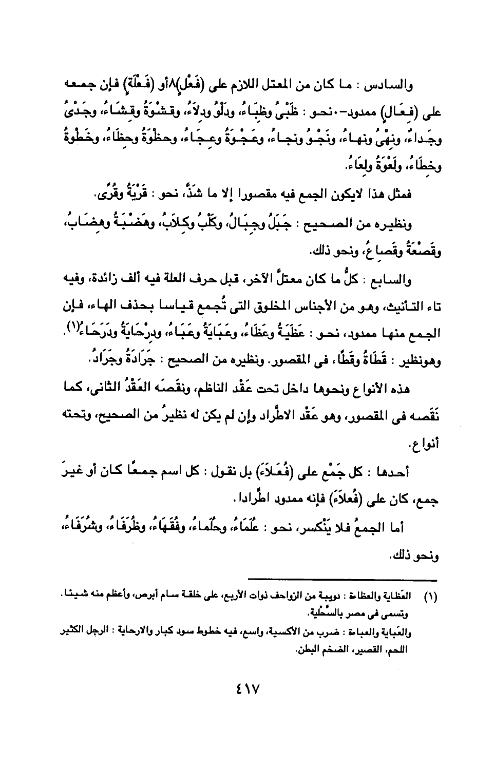 والسادس: ما كان من المعتل اللازم على (فعل) أو (فعلة) فإن جمعه على (فعال) ممدود - نحو: ظبى وظباء، ودلو ودلاء، وقشوة وقشاء، وجدى وجداء، ونهى ونهاء، ونجو ونجاء، وعجوة وعجاء، وحظوة وحظاء، وخطوة وخطاء، ولعوة ولعاء.