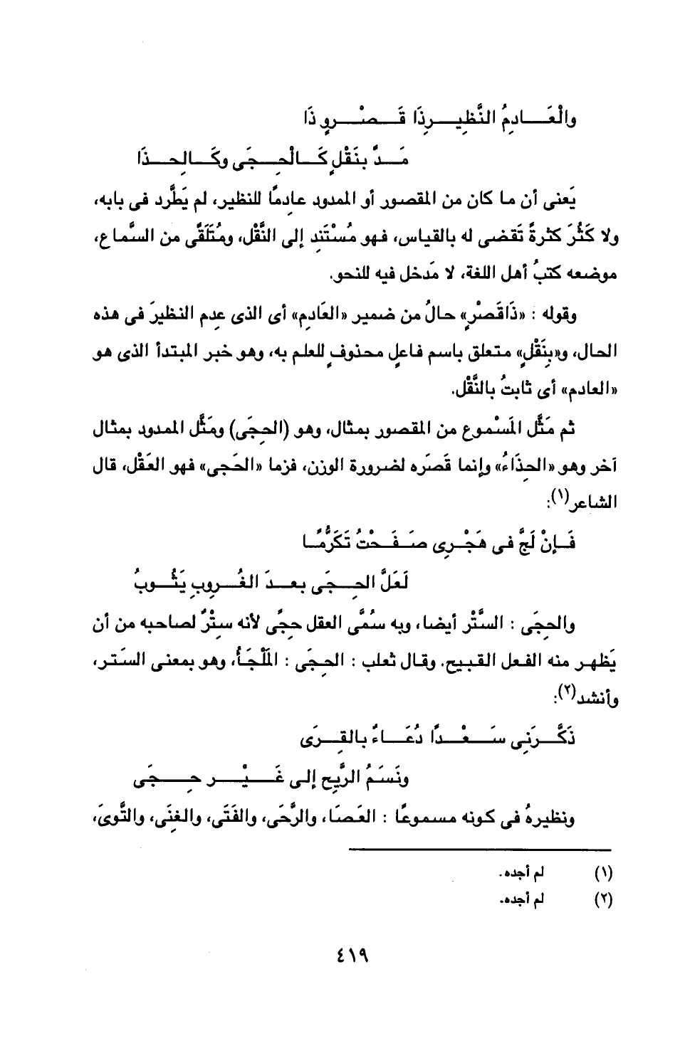 ثم مثل المسموع من المقصور بمثال، وهو (الحجى) ومثل الممدود بمثال آخر وهو "الحذاء" وإنما قصره لضرورة الوزن، فزما "الحجى" فهو العقل، قال الشاعر: