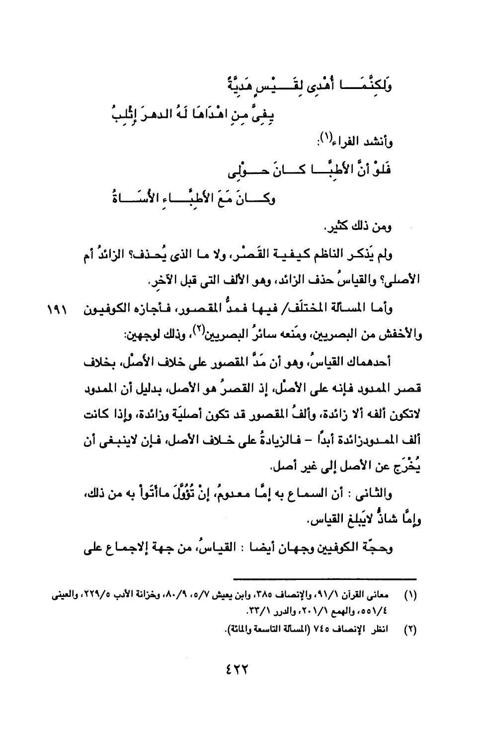 وأما المسألة المختلف/ فيها فمد المقصور، فأجازه الكوفيون والأخفش من البصريين، ومنعه سائر البصريين، وذلك لوجهين:
