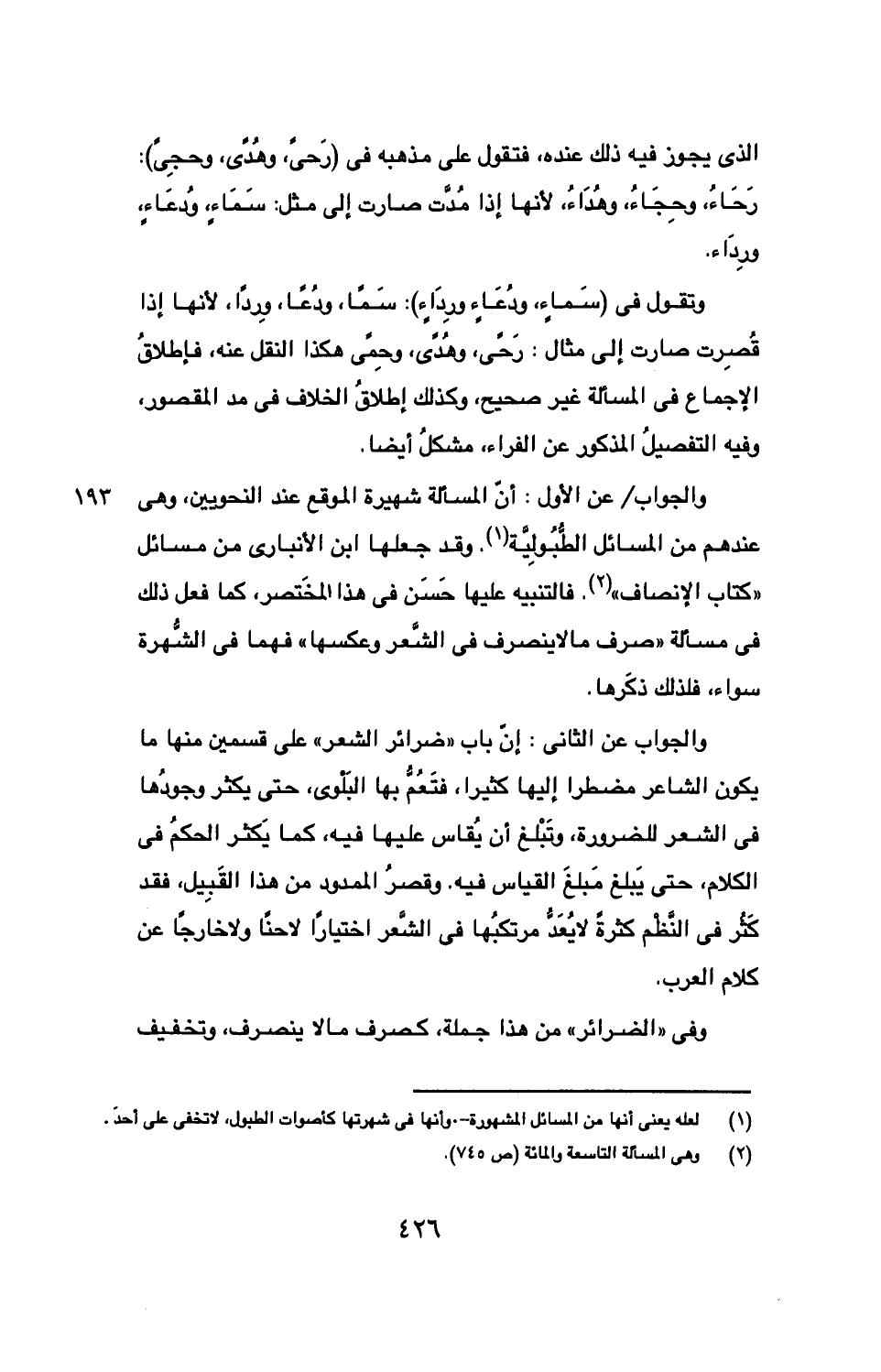 والجواب عن الثاني: إن باب "ضرائر الشعر" على قسمين منها ما يكون الشاعر مضطرًا إليها كثيرًا، فتعم بها البلوى، حتى يكثر وجودها في الشعر للضرورة، وتبلغ أن يقاس عليها فيه، كما يكثر الحكم في الكلام، حتى يبلغ مبلغ القياس فيه. وقصر الممدود من هذا القبيل، فقد كثر في النظم كثرة لا يعد مرتكبها في الشعر اختيارًا لاحنًا ولا خارجًا عن كلام العرب.