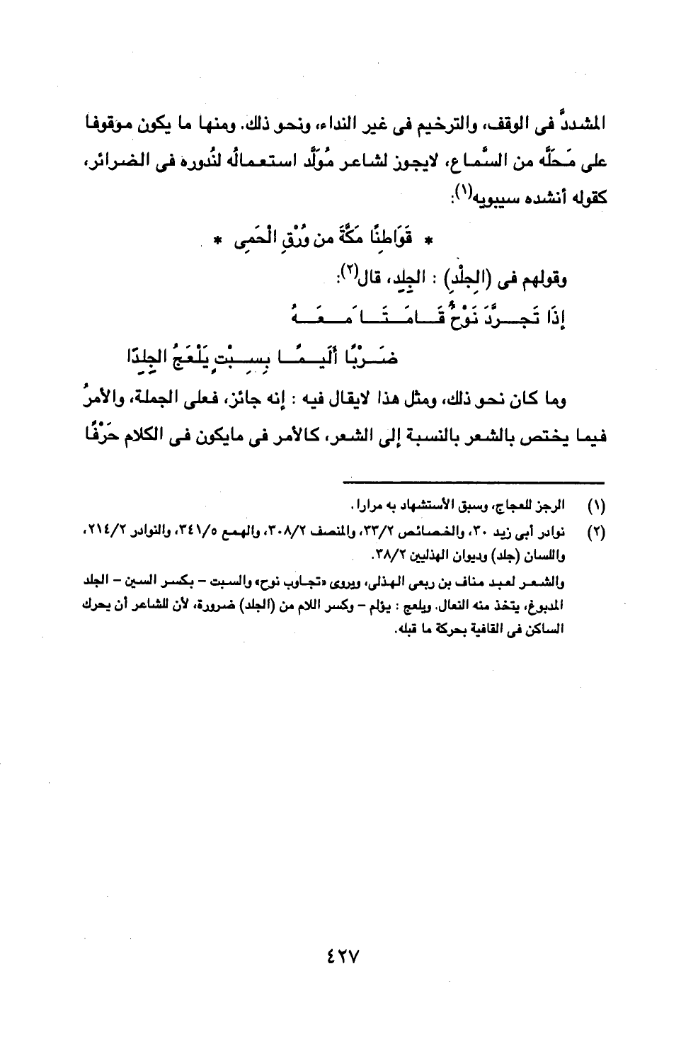 المشدد في الوقف، والترخيم في غير النداء، ونحو ذلك. ومنها ما يكون موقوفًا على محله من السماع، لا يجوز لشاعر مولد استعماله لندوره في الضرائر، كقوله أنشده سيبويه: