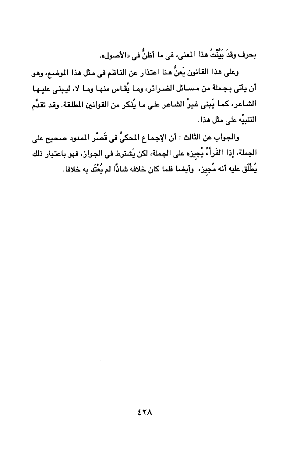والجواب عن الثالث: أن الإجماع المحكى في قصر الممدود صحيح على الجملة، إذا الفراء يجيزه على الجملة، لكن يشترط في الجواز، فهو باعتبار ذلك يطلق عليه أنه مجيز، وأيضًا فلما كان خلافه شاذًا لم يعتد به خلافًا.