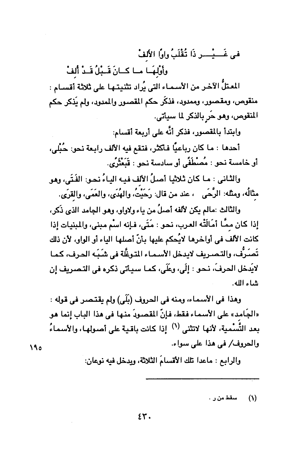 والثالث: ما لم يكن لألفه أصل من ياء ولا واو، وهو الجامد الذي ذكر، إذا كان مما أمالته العرب، نحو: متى، فإنه اسم مبنى، والمبنيات إذا كانت الألف في أواخرها لا يحكم عليها بأن أصلها الياء أو الواو، لأن ذلك تصرف، والتصريف لا يدخل الأسماء المتوغلة في شبه الحرف، كما لا يدخل الحرف، نحو: إلى، وعلى، كما سيأتي ذكره في التصريف إن شاء الله.