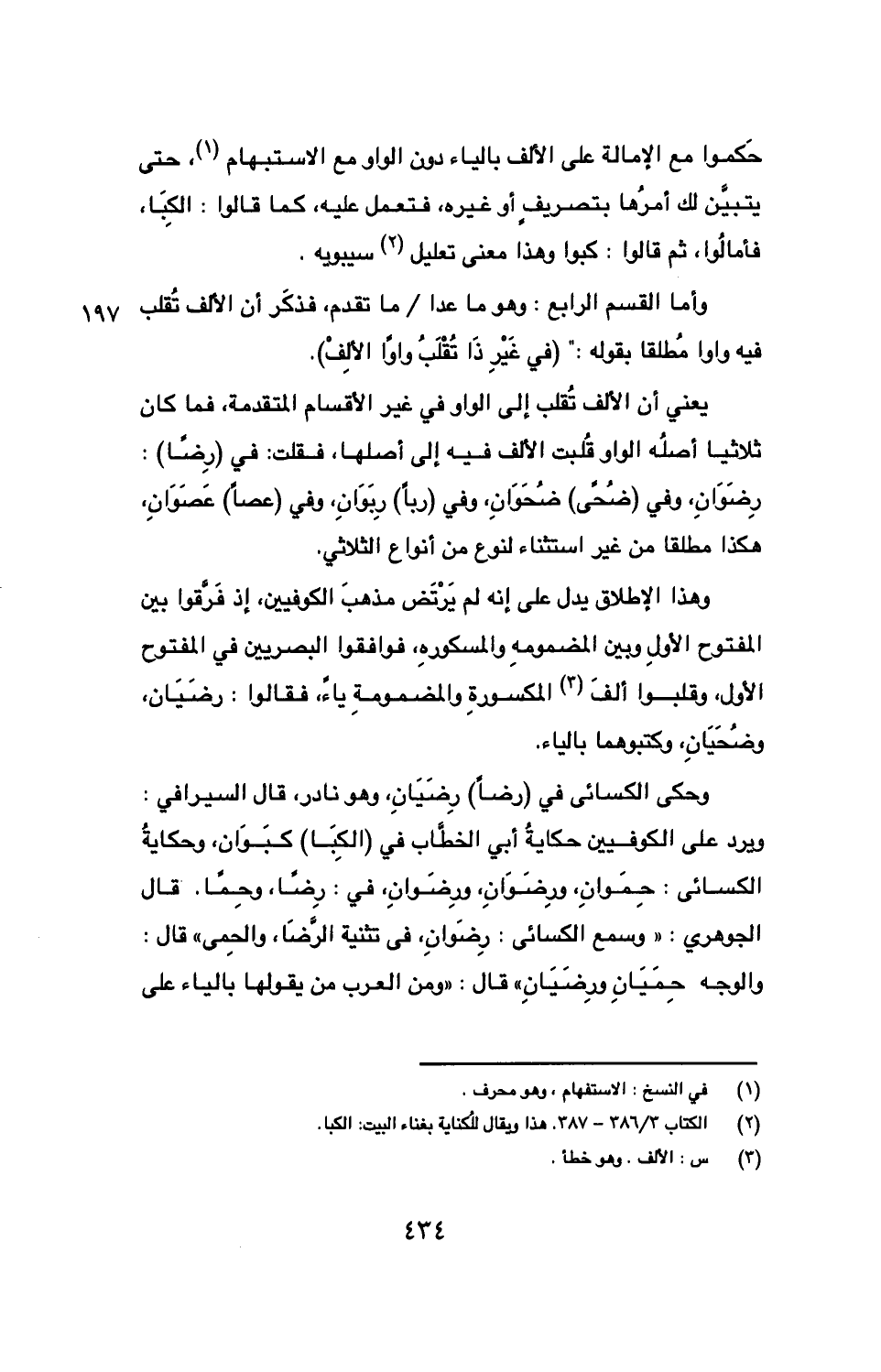 حكموا مع الإمالة على الألف بالياء دون الواو مع الاستبهام، حتى يتبين لك أمرها بتصريف أو غيره، فتعمل عليه، كما قالوا: الكبا، فأمالوا، ثم قالوا: كبوا وهذا معنى تعليل سيبويه.