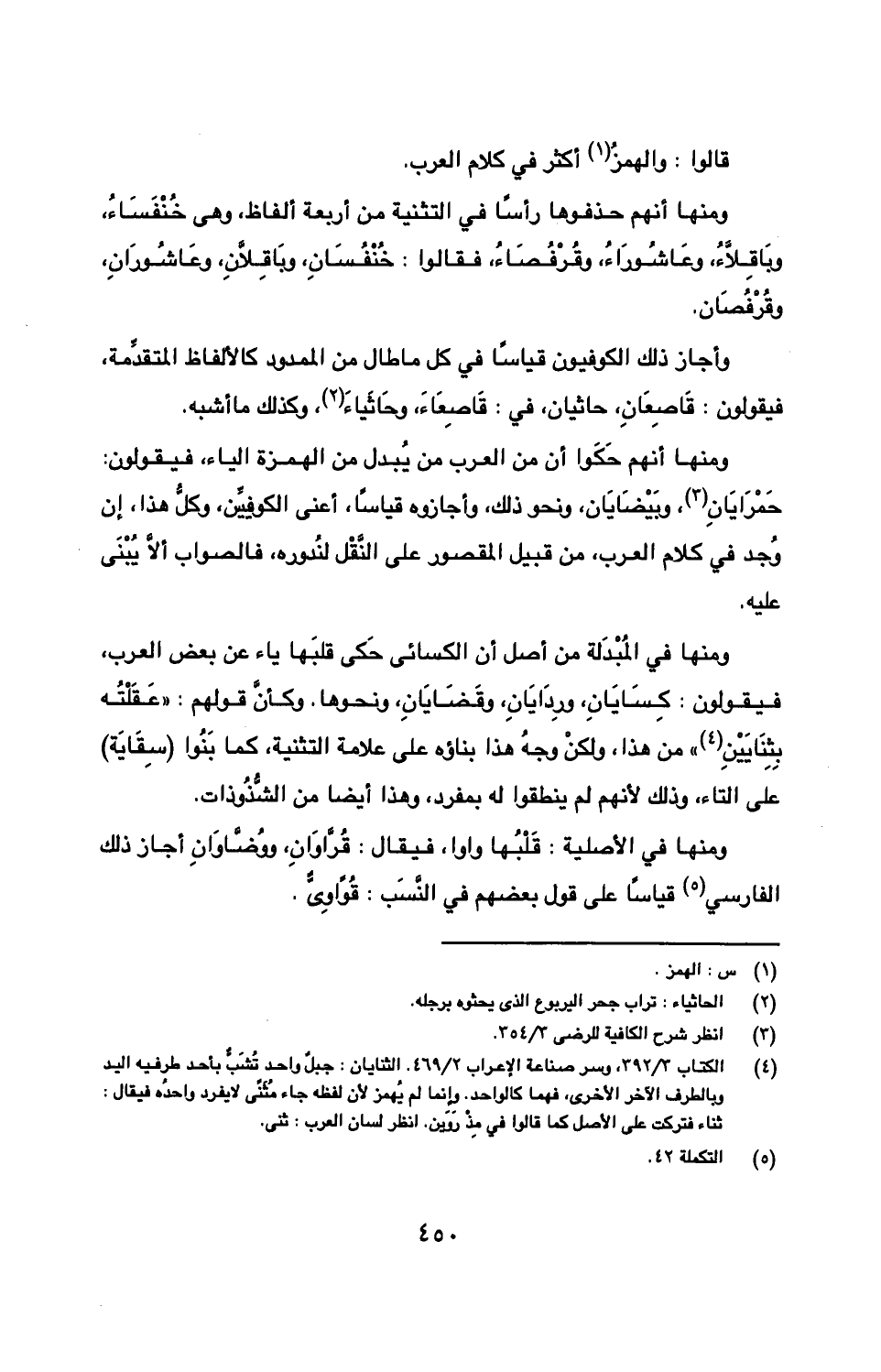 ومنها أنهم حكوا أن من العرب من يبدل من الهمزة الياء, فيقولون: حمرايان, وبيضايان, ونحو ذلك, وأجازوه قياسًا, أعنى الكوفيين, وكل هذا, إن وجد في كلام العرب, من قبيل المقصور على النقل لندوره, فالصواب ألا يبني عليه.