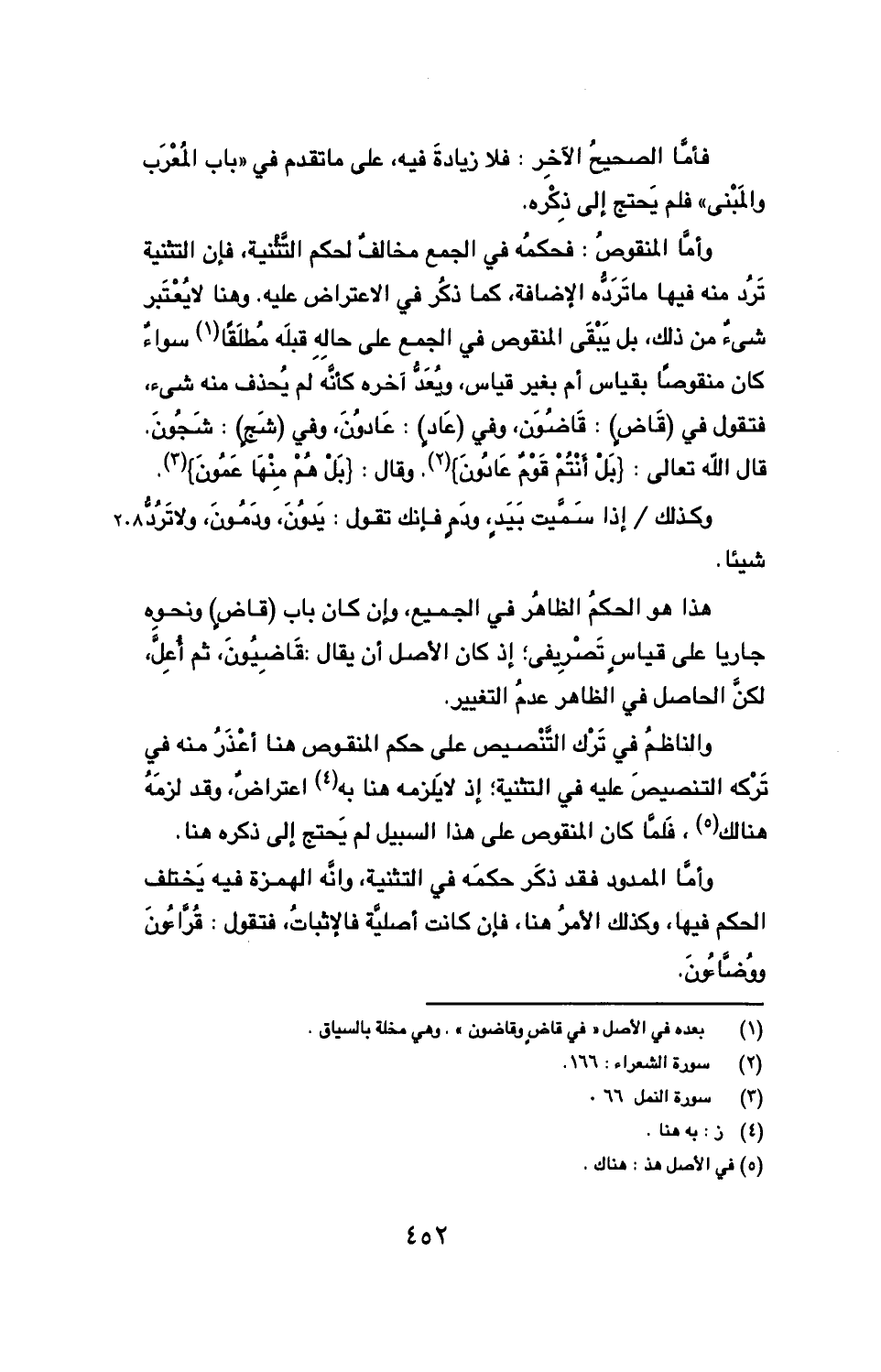 وأما المنقصوص: فحكمه في الجمع مخالف لحكم التثنية, فإن التثنية ترد منه فيها ما ترده الإضافة, كما ذكر في الاعتراض عليه. وهنا لا يعتبر شيء من ذلك, بل يبقى المنقوص في الجمع على حاله قبله مطلقًا سواء كان منقوصًا بقياس أم بغير قياس, ويعد آخره كأنه لم يحذف منه شيء, فتقول في (قاض): قاضون, وفي (عاد): عادون, وفي (شج): شجون. قال الله تعالى: } بل أنتم قوم عادون} , وقال: } بل هم منها عمون}.