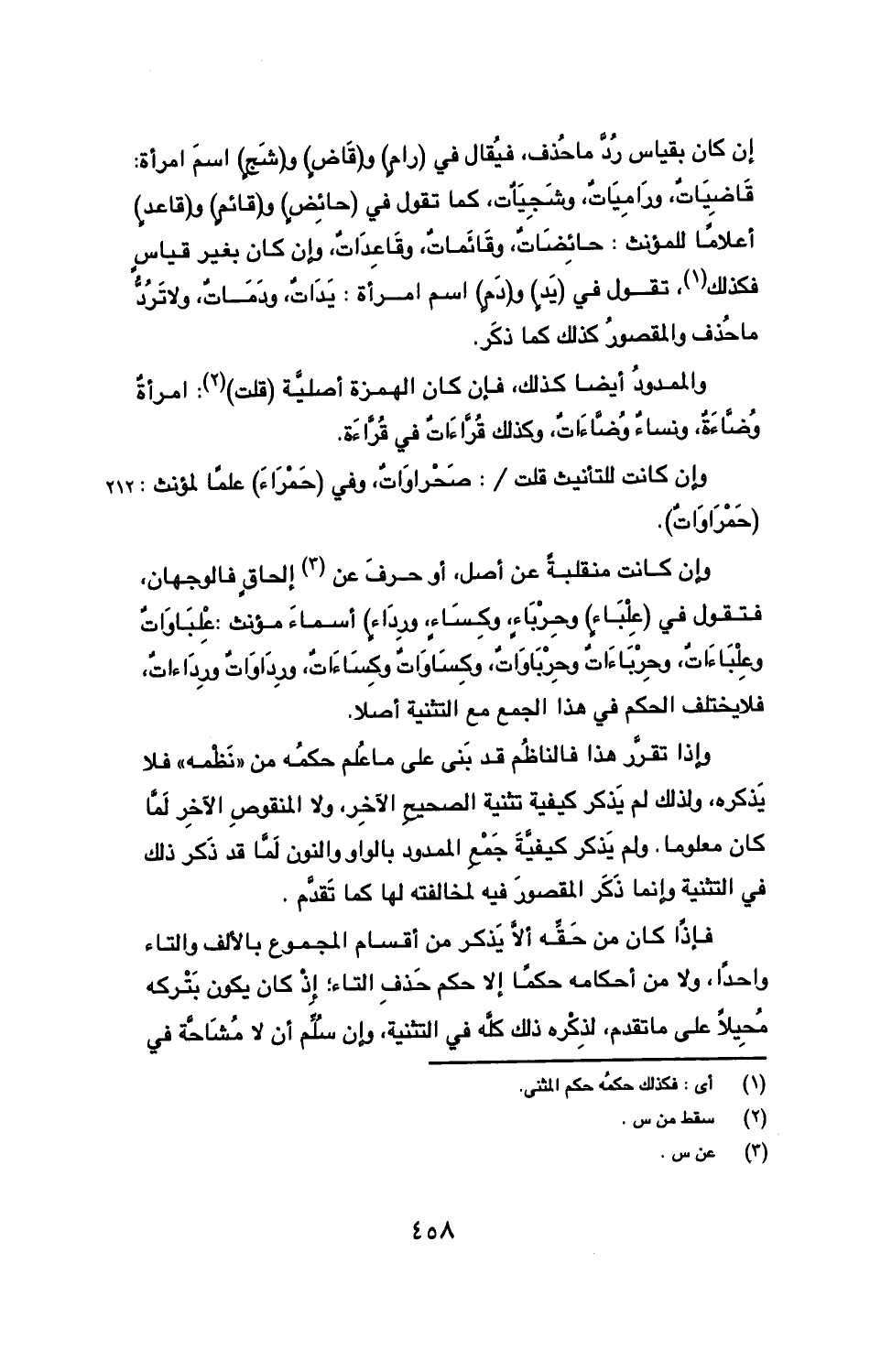 فإذا كان من حقه ألا يذكر من أقسام المجموع بالألف والتاء واحدًا, ولا من أحكامه حكمًا إلا حكم حذف التاء, إذ كان يكون بتركه محيلاً على ما تقدم, لذكره ذلك كله في التثنية, وإن سلم أن لا مشاحة في