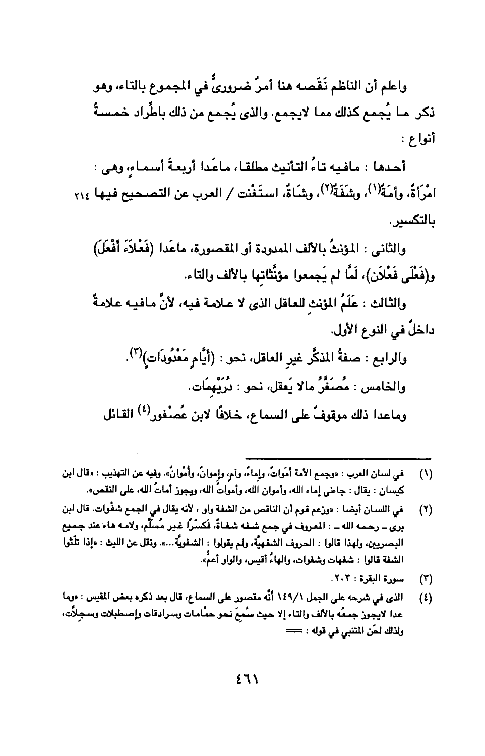 أحدها: ما فيه تاء التأنيث مطلقًا, ما عدا أربعة أسماء, وهي: امرأة, وأمة, وشفة, وشاة، استغنت/ العرب عن التصحيح فيها بالتكسير.