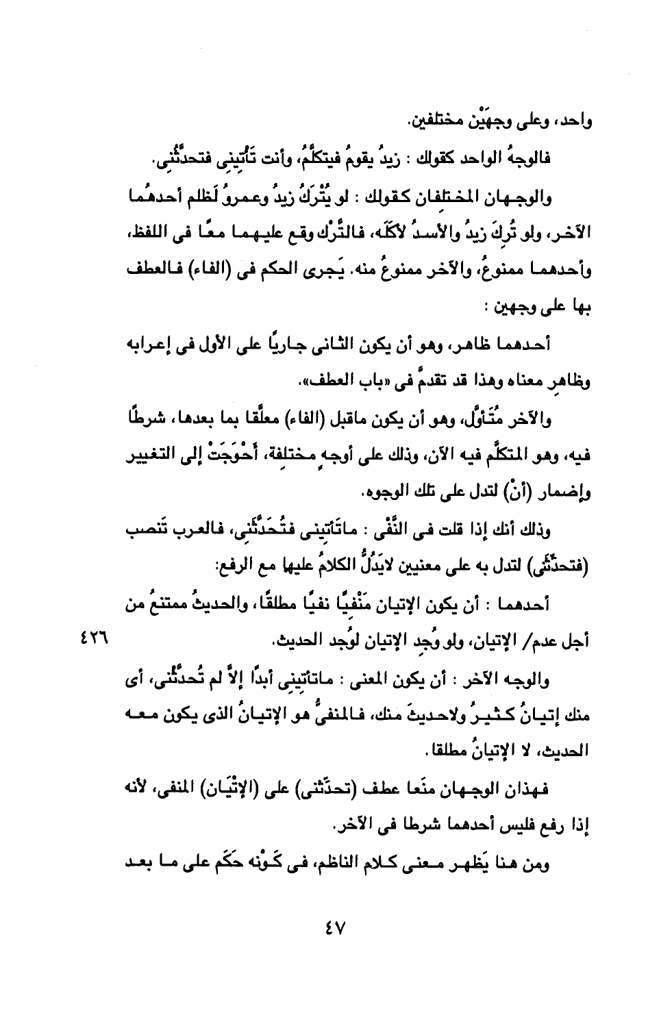 فالوجه الواحد كقولك: زيد يقوم فيتكلم، وأنت تأتيني فتحدثني.