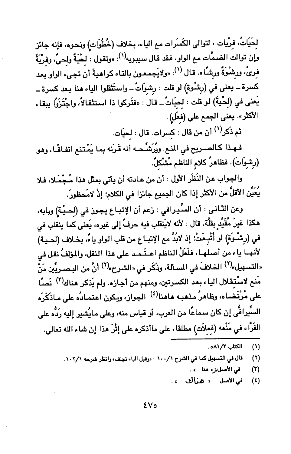 لحيات, فريات, لتوالي الكسرات مع الياء, بخلاف (خطوات) ونحوه, فإنه جائز وإن توالت الضمات مع الواو, فقد قال سيبويه: "وتقول: لحية ولحى, وفرية فرى, ورشوة ورشًا". قال: "ولا يجمعون بالتاء كراهية أن تجيء الواو بعد كسرة - يعني في (رشوةٍ) لو قلت: رشوات - واستثقلوا الياء هنا بعد كسرة - يعني في (لحية) لو قلت: لحيات - قال: "فتركوا ذا استثقالاً, واجتزوا ببقاء الأكثر". يعني الجمع على (فعل).