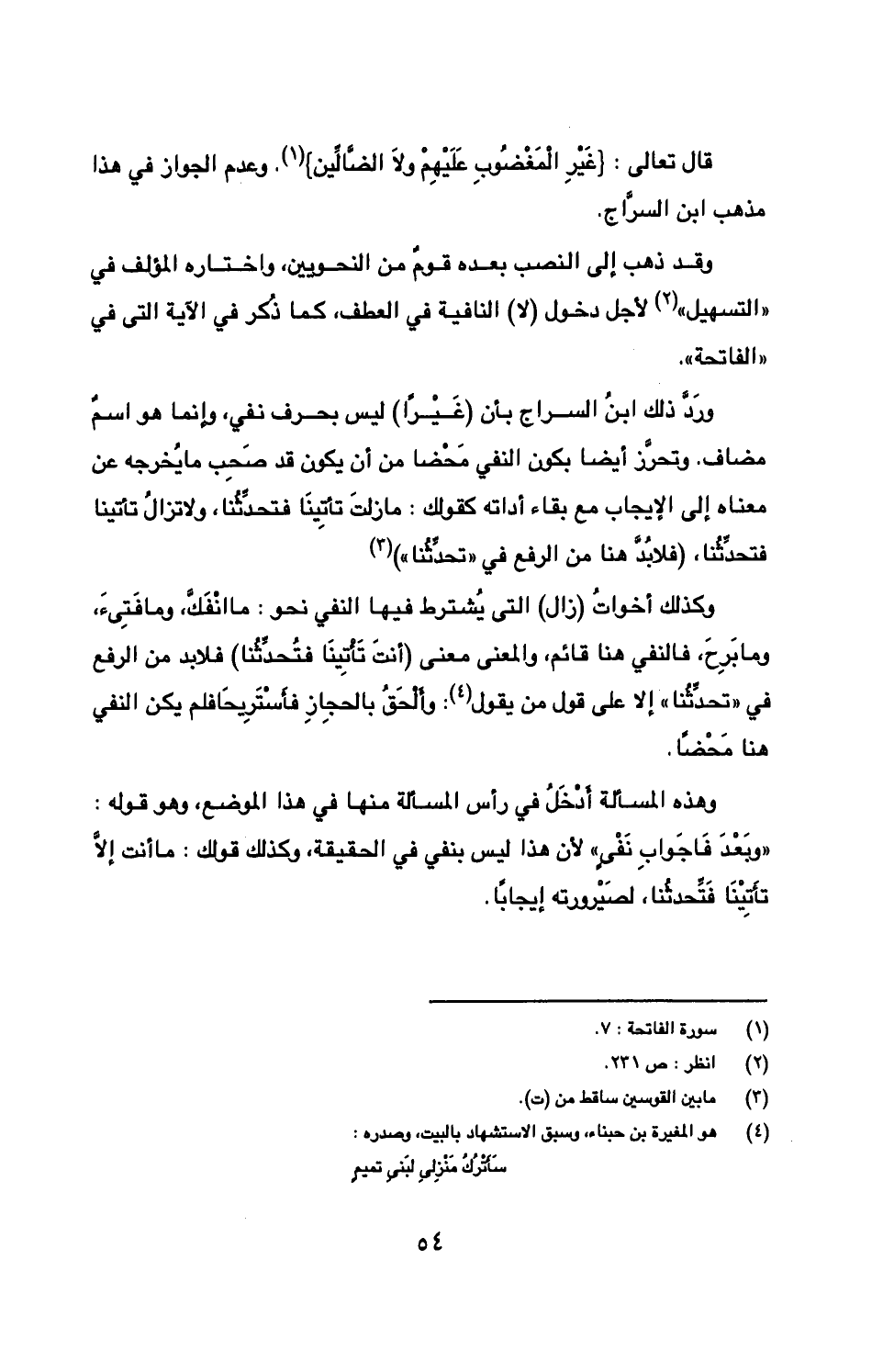 ورد ذلك ابن السراج بأن (غيرا) ليس بحرف نفي، وإنما هو اسم مضاف. وتحرز أيضا بكون النفي محضا من أن يكون قد صحب ما يخرجه عن معناه إلى الإيجاب مع بقاء أداته كقولك: ما زلت تأتينا فتحدثنا، ولا تزال تأتينا فتحدثنا، (فلا بد هنا من الرفع في "تحدثنا").