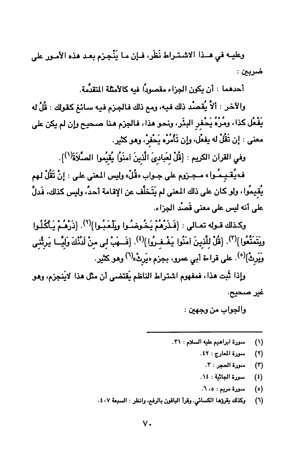 ف "يقيموا" مجزوم على جواب "قل" وليس المعنى على: إن تقل لهم يقيموا، ولو كان على ذلك المعنى لم يتخلف عن الإقامة أحد، وليس كذلك، فدل على أنه ليس على معنى قصد الجزاء.