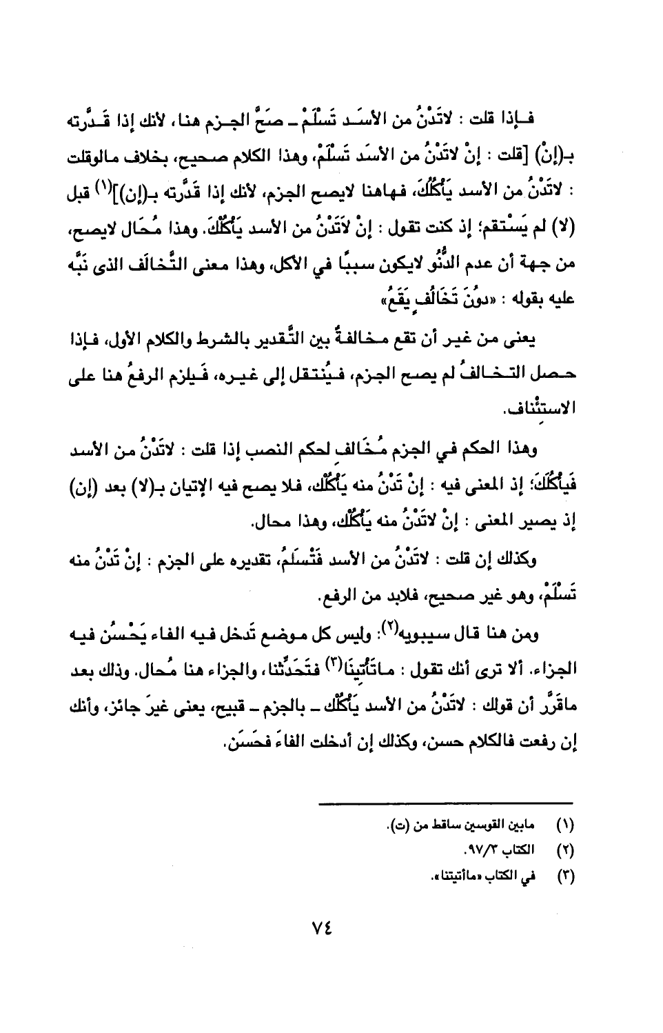 وكذلك إن قلت: لا تدن من الأسد تسلم، تقديره على الجزم: إن تدن منه تسلم، وهو غير صحيح، فلا بد من الرفع.