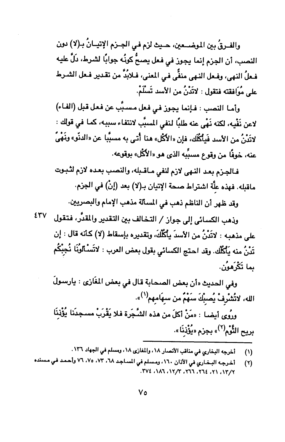 والفرق بين الموضعين، حيث لزم في الجزم الإتيان ب (لا) دون النصب، أن الجزم إنما يجوز في فعل يصح كونه جوابا لشرط، دل عليه فعل النهي، وفعل النهي منفي في المعنى، فلا بد من تقدير فعل الشرط على موافقته فتقول: لا تدن من الأسد تسلم.