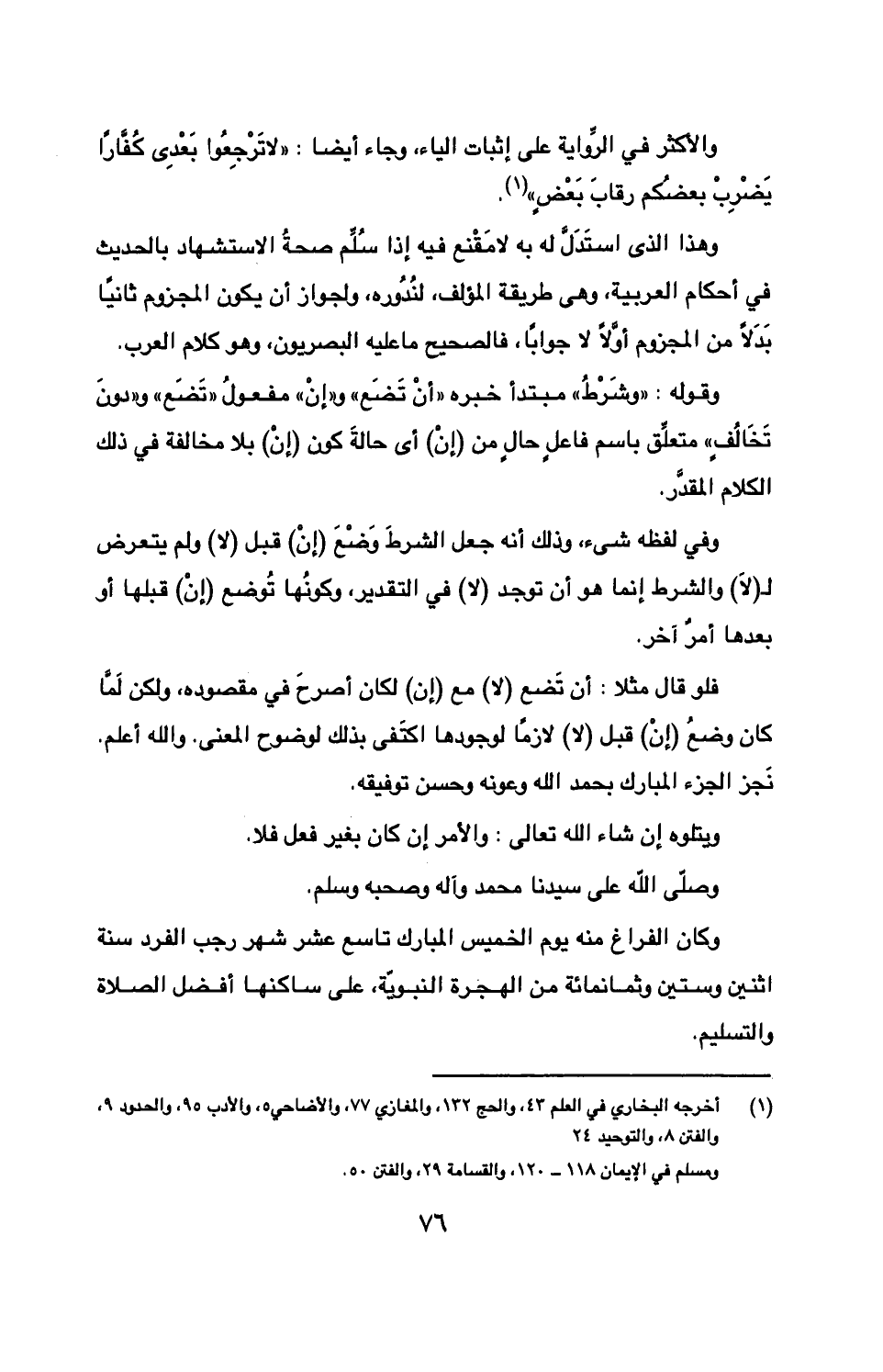 فلو قال مثلا: أن تضع (لا) مع (إن) لكان أصرح في مقصوده، ولكن لما كان وضع (إن) قبل (لا) لازما لوجودها اكتفى بذلك لوضوح المعنى. والله أعلم. نجز الجزء المبارك بحمد الله وعونه وحسن توفيقه.