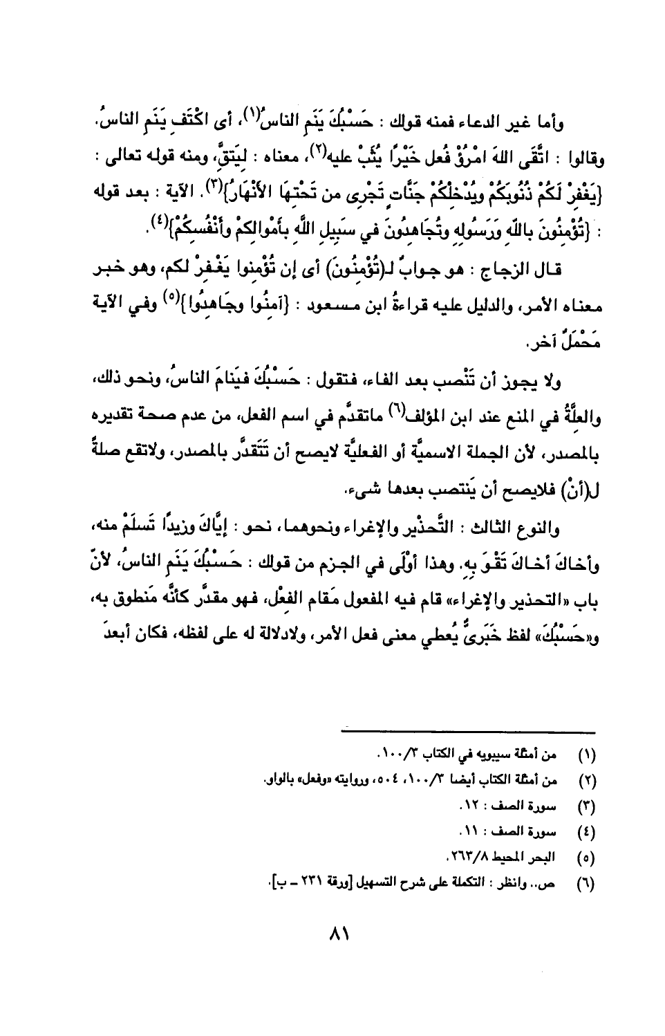 ولا يجوز أن تنصب بعد الفاء، فتقول: حسبك فينام الناس، ونحو ذلك، والعلة في المنع عند ابن المؤلف ما تقدم في اسم الفعل، من عدم صحة تقديره بالمصدر، لأن الجملة الاسمية أو الفعلية لا يصح أن تتقدر بالمصدر، ولا تقع صلة ل (أن) فلا يصح أن ينتصب بعدها شيء.