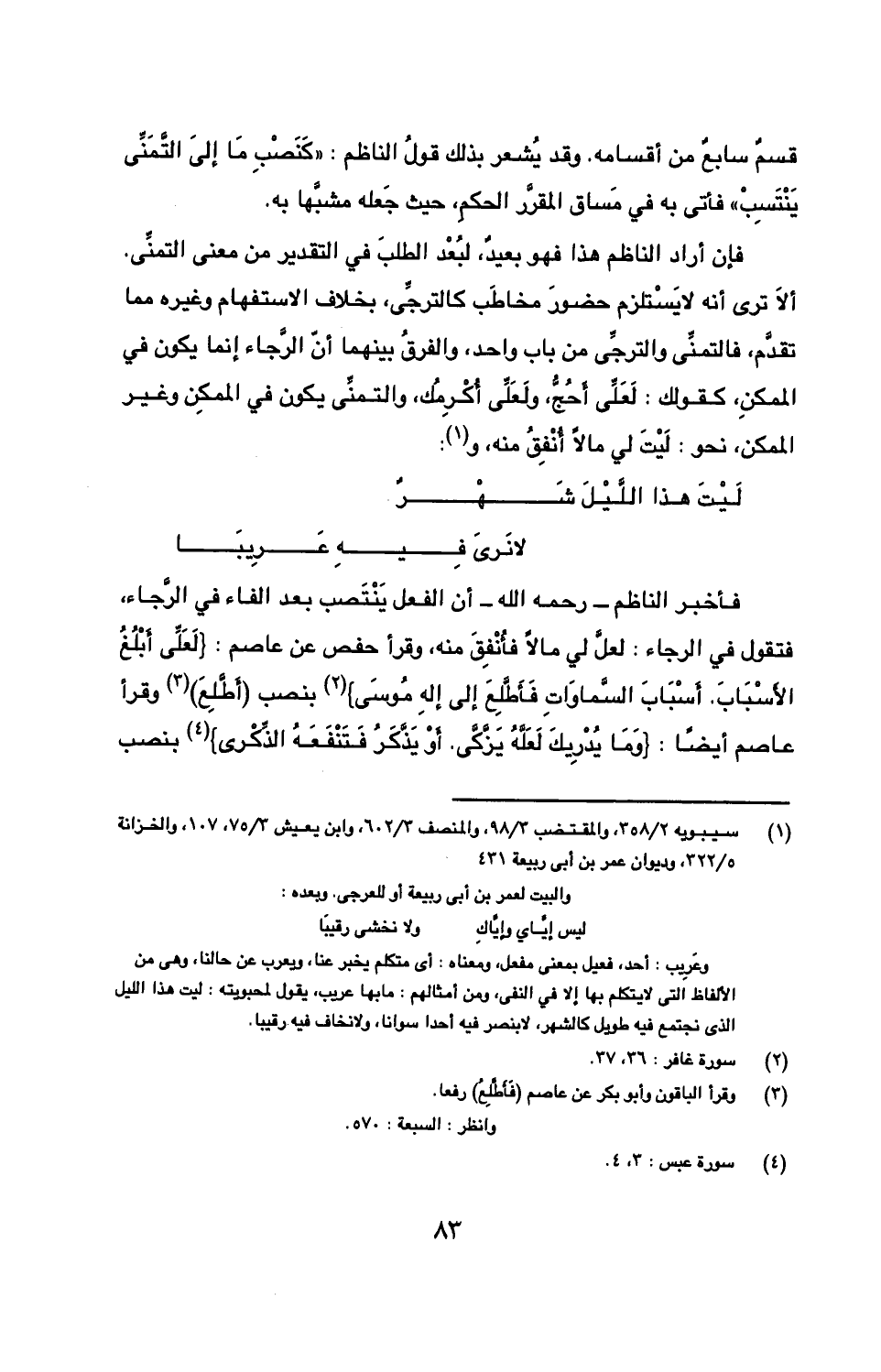 فأخبر الناظم- رحمه الله- أن الفعل ينتصب بعد الفاء في الرجاء، فتقول في الرجاء: لعل لي مالا فأنفق منه، وقرأ حفص عن عاصم: } لعلي أبلغ الأسباب. أسباب السماوات فأطلع إلى إله موسى} بنصب (أطلع) وقرأ عاصم أيضا: } وما يدريك لعله يزكي. أو يذكر فتنفعه الذكرى} بنصب
