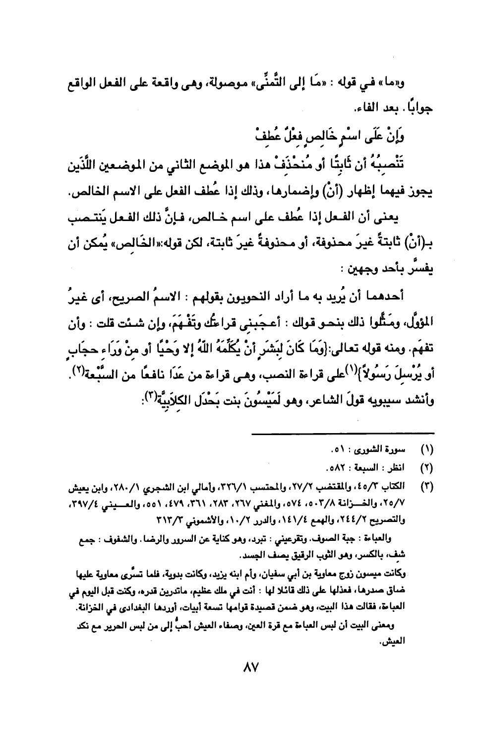 أحدهما أن يريد به ما أراد النحويون بقولهم: الاسم الصريح، أي غير المؤول، ومثلوا ذلك بنحو قولك: أعجبني قراءتك وتفهم، وإن شئت قلت: وأن تفهم. ومنه قوله تعالى: } وما كان لبشر أن يكلمه الله إلا وحيا أو من وراء حجاب أو يرسل رسولا} على قراءة النصب، وهي قراءة من عدا نافعا من السبعة. وأنشد سيبويه قول الشاعر، وهو لميسون بنت بحدل الكلابية: