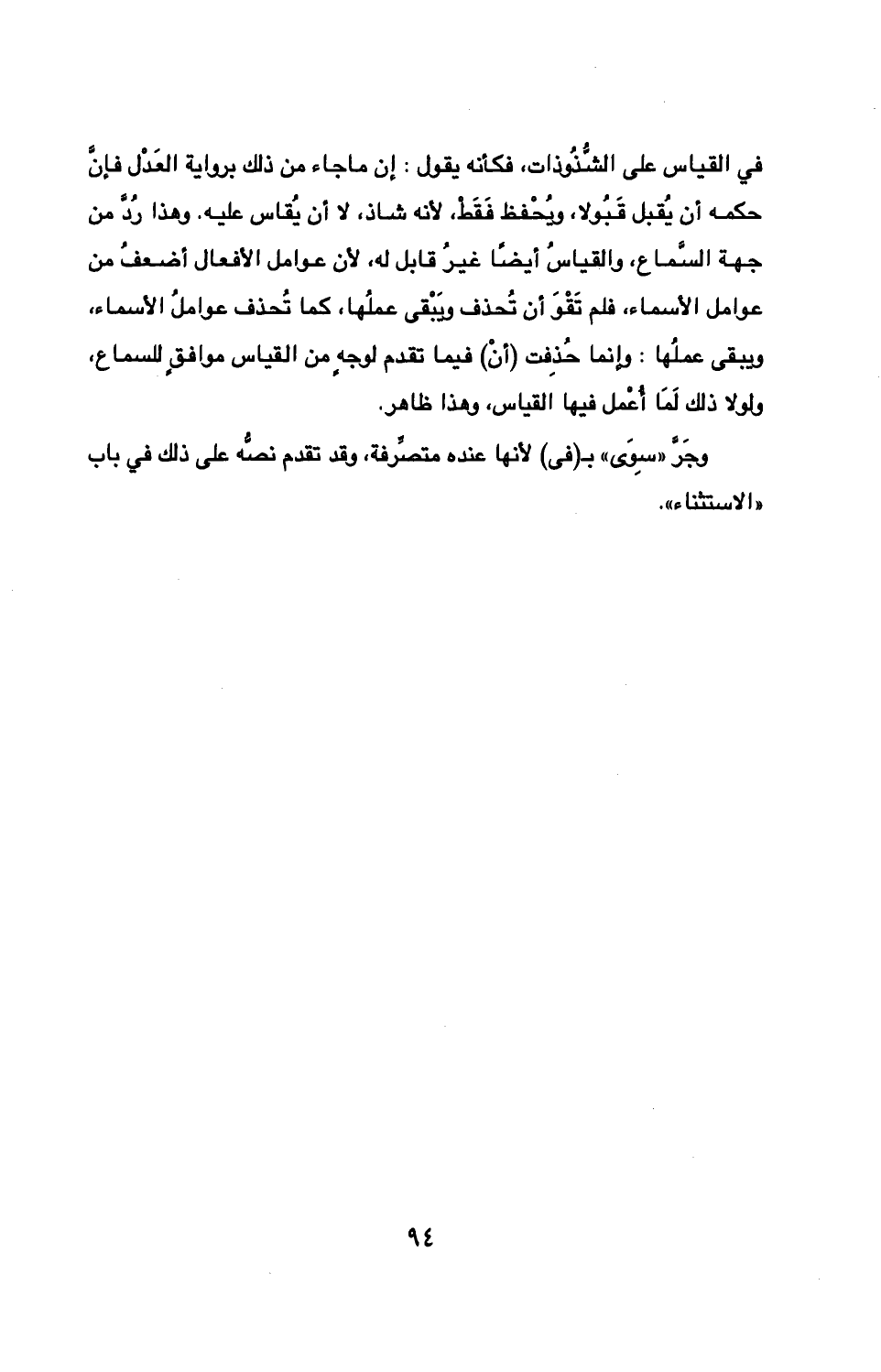 في القياس على الشذوذات، فكأنه يقول: إن ما جاء من ذلك برواية العدل فإن حكمه أن يقبل قبولا، ويحفظ فقط، لأنه شاذ، لا أن يقاس عليه. وهذا رد من جهة السماع، والقياس أيضا غير قابل له، لأن عوامل الأفعال أضعف من عوامل الأسماء، فلم تقو أن تحذف ويبقى عملها، كما تحذف عوامل الأسماء، ويبقى عملها: وإنما حذفت (أن) فيما تقدم لوجه من القياس موافق للسماع، ولولا ذلك لما أعمل فيها القياس، وهذا ظاهر.