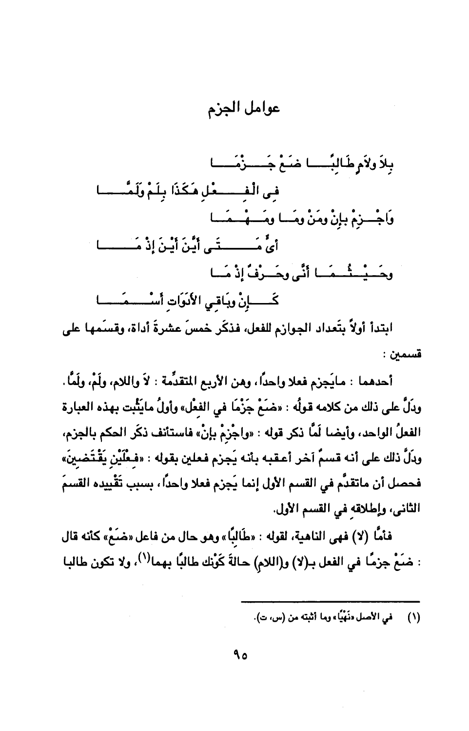 ابتدأ أولا بتعداد الجوازم للفعل، فذكر خمس عشرة أداة، وقسمها على قسمين: